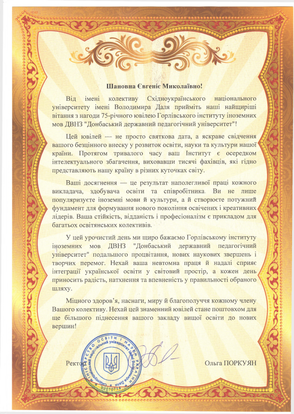 Share Thank you very much for the congratulations on the 75th anniversary of our institute from the V. Dahl East Slavic National University