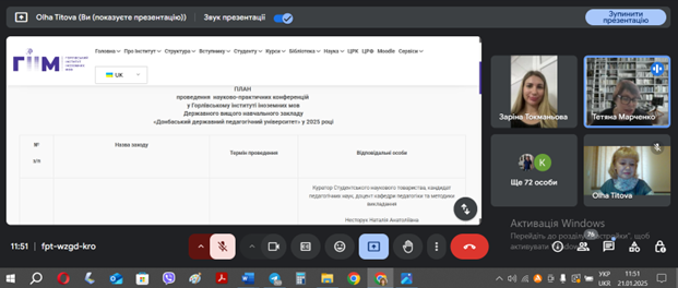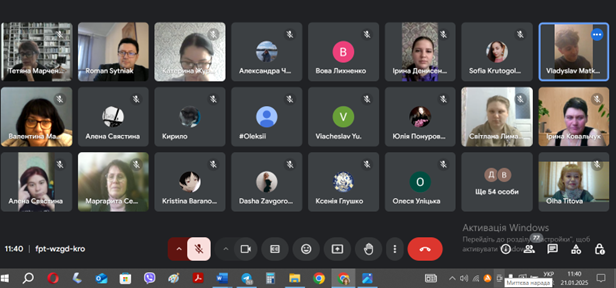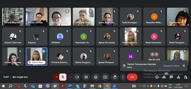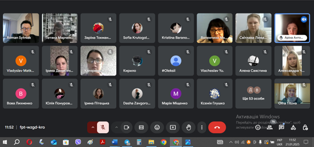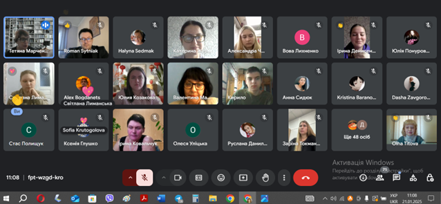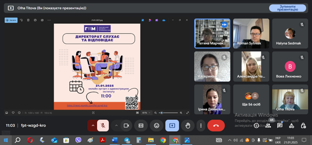 It is very important for each of us to be heard. That is why on January 21, 2025, an online meeting of representatives of the institute's administration with students was held in the format of an open dialogue. Deputy Director for Scientific, Pedagogical and Educational and Methodological Work Tetyana MARCHENKO, Dean of the Faculty of Romance and Germanic Languages Roman SYTNYAK, Dean of the Faculty of Social and Language Communication Valentyna MARAKHOVSKA, Head of the Department for Monitoring the Quality of Higher Education Olga TITOVA, Head of the Department for Organizing Students' Educational Work Kateryna ZHURBYLYUK, and Chair of the Student Parliament Iryna DENYSENKO congratulated the applicants on the completion of the winter assessment and examination session, summed up the results of the university's work in the first half of the year and answered questions from those present regarding the educational process, students' scientific work, leisure activities, and participation in grants and competitions.