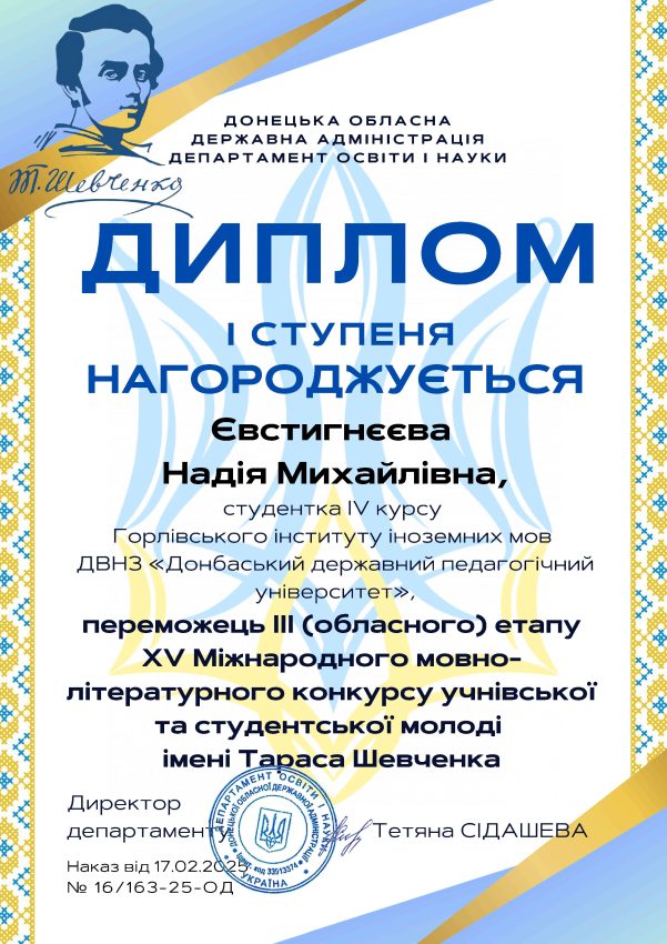 This year, 4th-year students of the educational and professional program "Secondary Education (Ukrainian Language and Literature). Psychology" Khrychykova Victoria sat down 1st place at the regional stage XXV International Ukrainian Language Competition named after Petro Jacyk, a Evstigneeva Nadiya – 1 place at the regional stage XV International Taras Shevchenko Language and Literary Competition for School and Student YouthWe sincerely congratulate the girls on their creative victories and are proud of the achievements of the department!