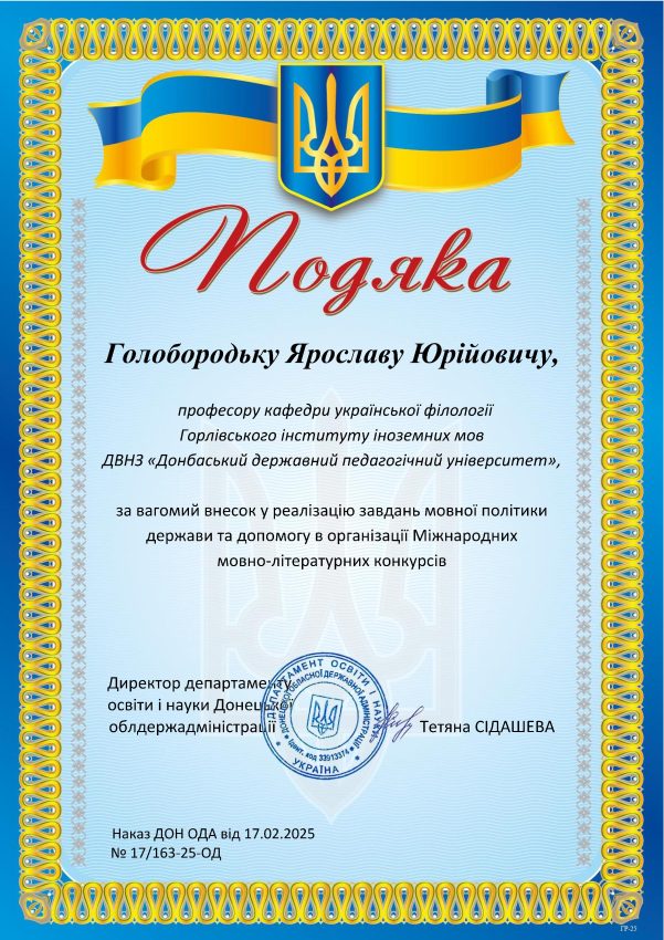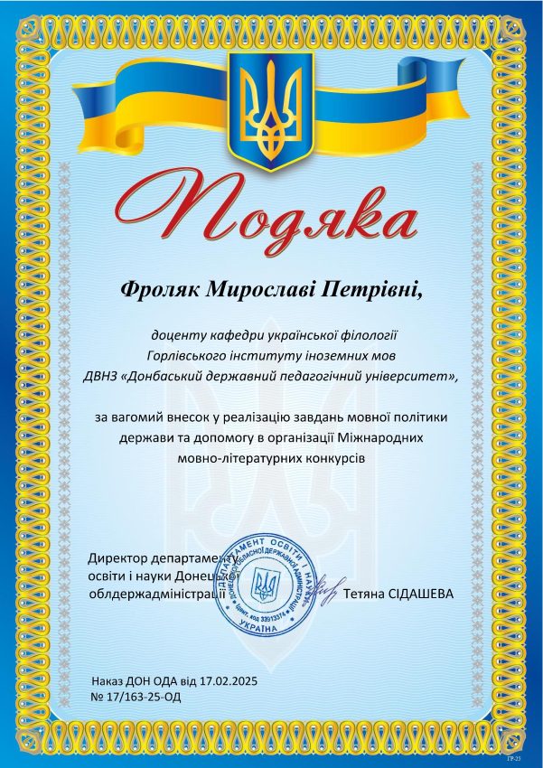 All members of the Department of Ukrainian Philology received Certificates of Gratitude from the Department of Education and Science of the Donetsk Regional State Administration! This recognition is evidence of high professionalism, tireless work, and a significant contribution to the popularization of the Ukrainian language and literature.