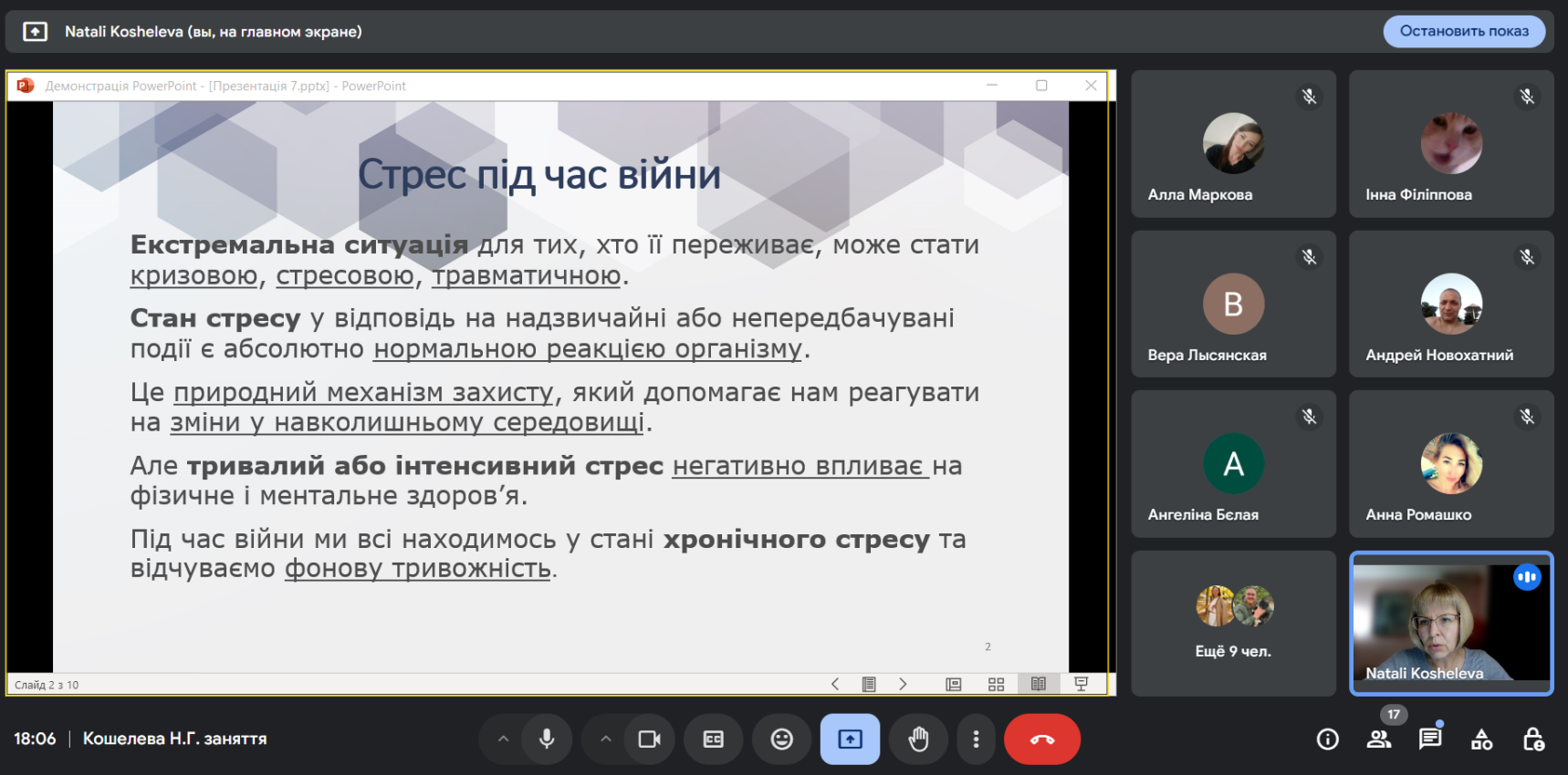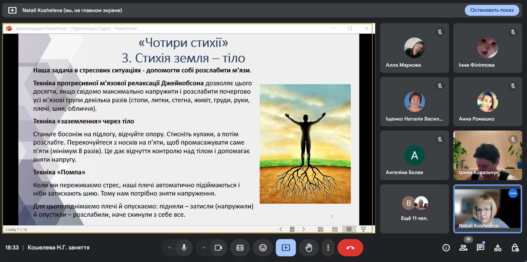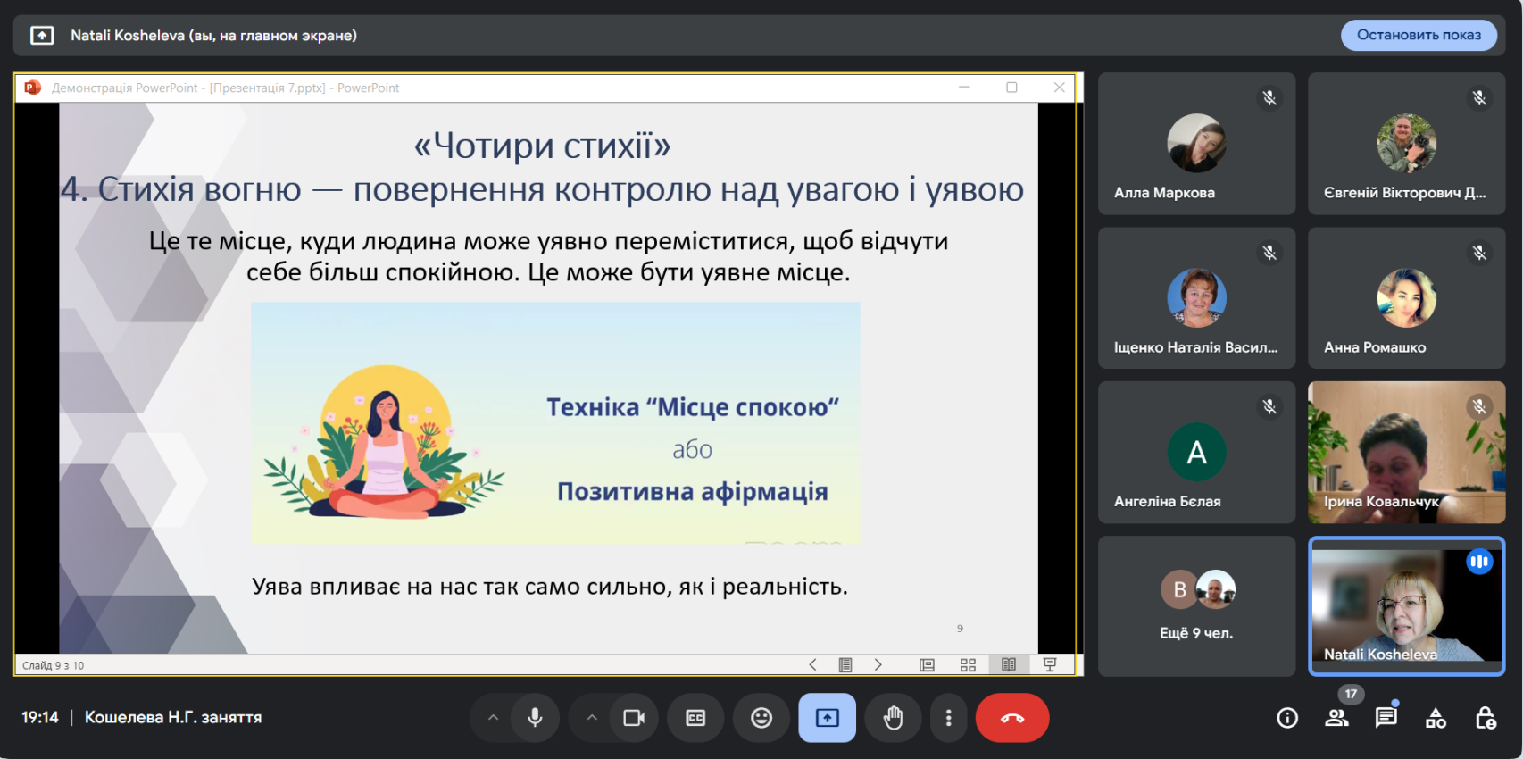 Participants had the opportunity to familiarize themselves with the emotional stabilization protocol "Four Elements", tried to perform techniques for regulating breathing, relaxing muscles, "grounding" through the body, monitored their feelings and states after their implementation. Also, those present at the meeting got acquainted with the technique "Place of Peace", which is used to regain control over attention and imagination, and had the opportunity to perform it in an art therapy format, which aroused interest, positive emotions and a state of calm. Participants received practical skills in applying techniques that can be used for self-regulation, that is, managing their psycho-emotional state in stressful situations.