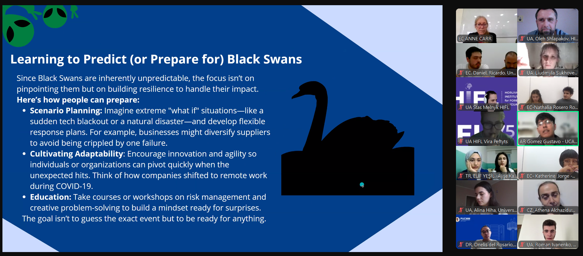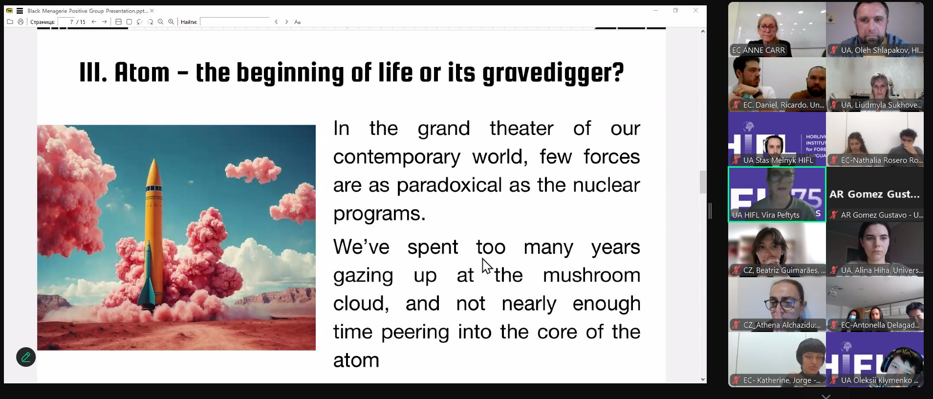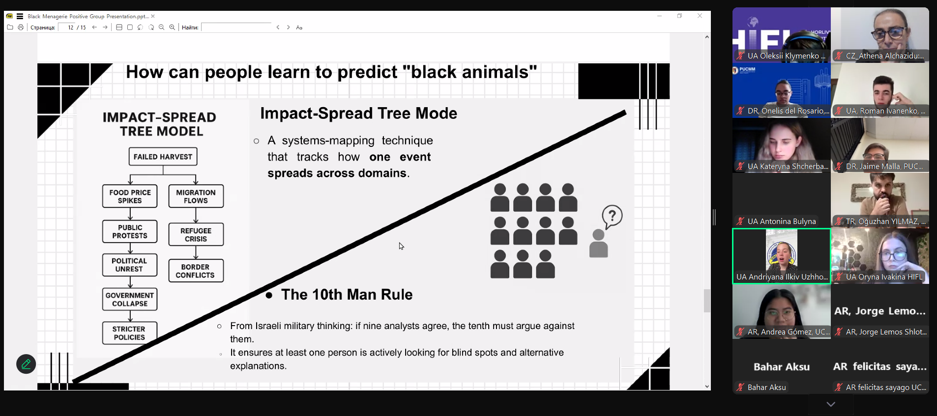 On Wednesday, May 7, 2025, another meeting of the Black Menagerie project participants took place. This meeting was special and unique! This time, two international student teams presented their vision of the “black menagerie”. The work of these teams was led by students of our institute Stas Melnyk and Vira Peftits. The teams also included applicants from the University of Azuay (Ecuador), Masaryk University (Czech Republic), University of Uzhhorod (Ukraine), Erzincan Binali Yıldırım University (Turkey) and Catholic University of Salta (Argentina).