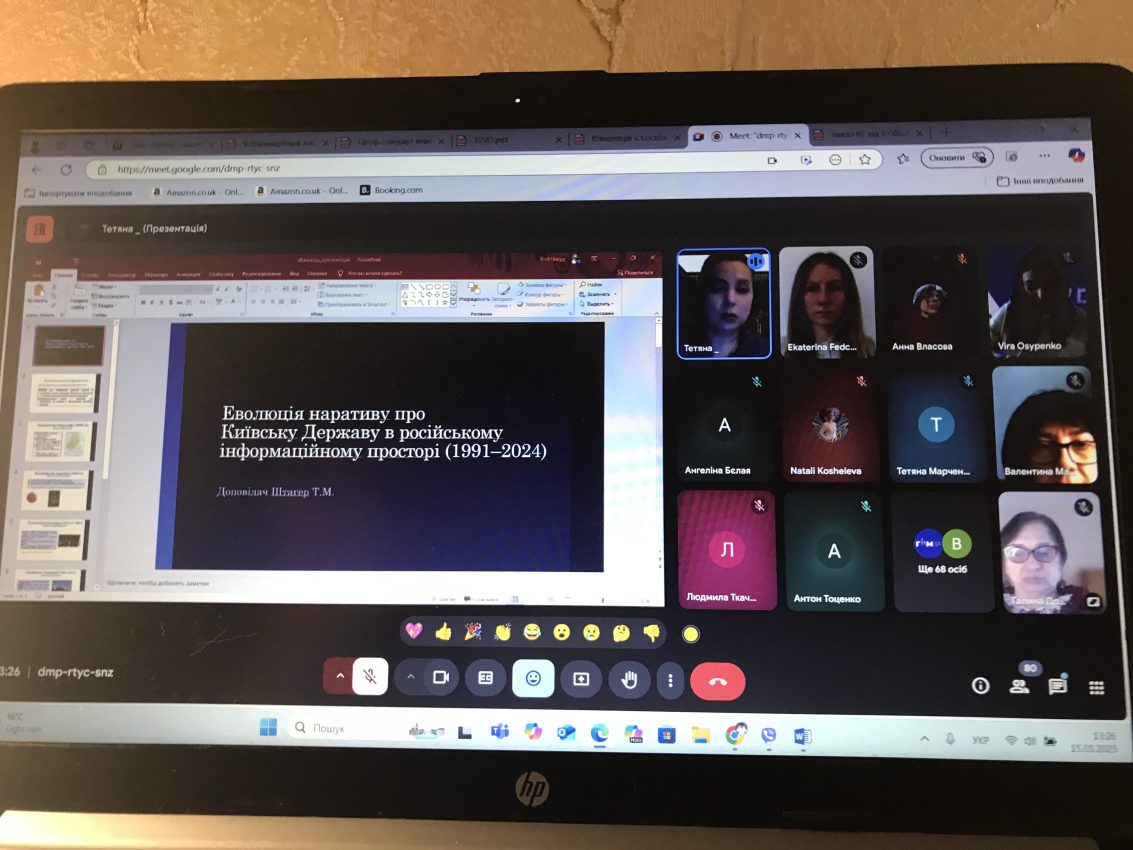 At the conference of young scientists on April 15, we were already able to get acquainted with the first results of work on the topic, as at the plenary session we heard a report by T. Shtager “The Evolution of the Narrative about the Kyivan State in the Russian Information Space (1991-2024)”. She identified the stages of development of this narrative, based on the analysis of documents, materials in the media, and scientific works of Ukrainian and foreign authors.