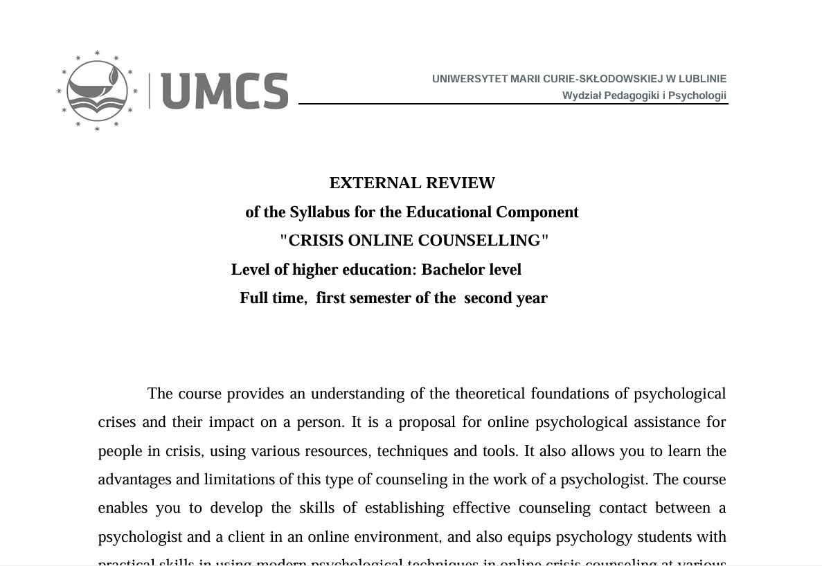 It is worth noting that the pilot testing of the course "Mindfulness-Based Art Therapy with Trauma" at GIIM is already underway in the second semester of the 2024–2025 academic year in the master's level study groups (504 and 505). The course "Crisis Online Counseling" will be introduced for the first time next academic year for second-year students of the OPP "Practical Psychology".