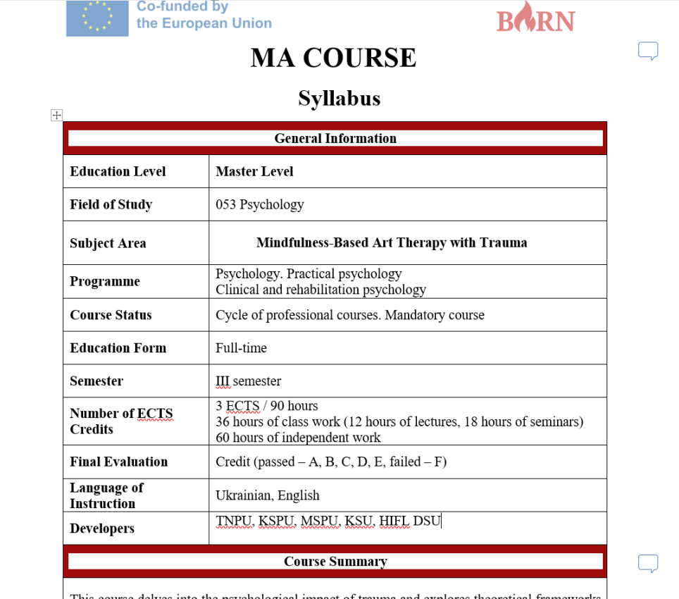 In February 2025, working groups of psychology teachers from five Ukrainian universities, participants in the Erasmus+ BURN project "Strengthening Psychological Resilience and Well-being of Universities in (Post-)War Ukraine", practically completed the development of new training courses "Crisis online counseling" (bachelor's level), "Mindfulness-oriented art therapy of trauma" (taught in English, master's level) and the training module "Working with refugees and war survivors" (for PhD program, taught in English).