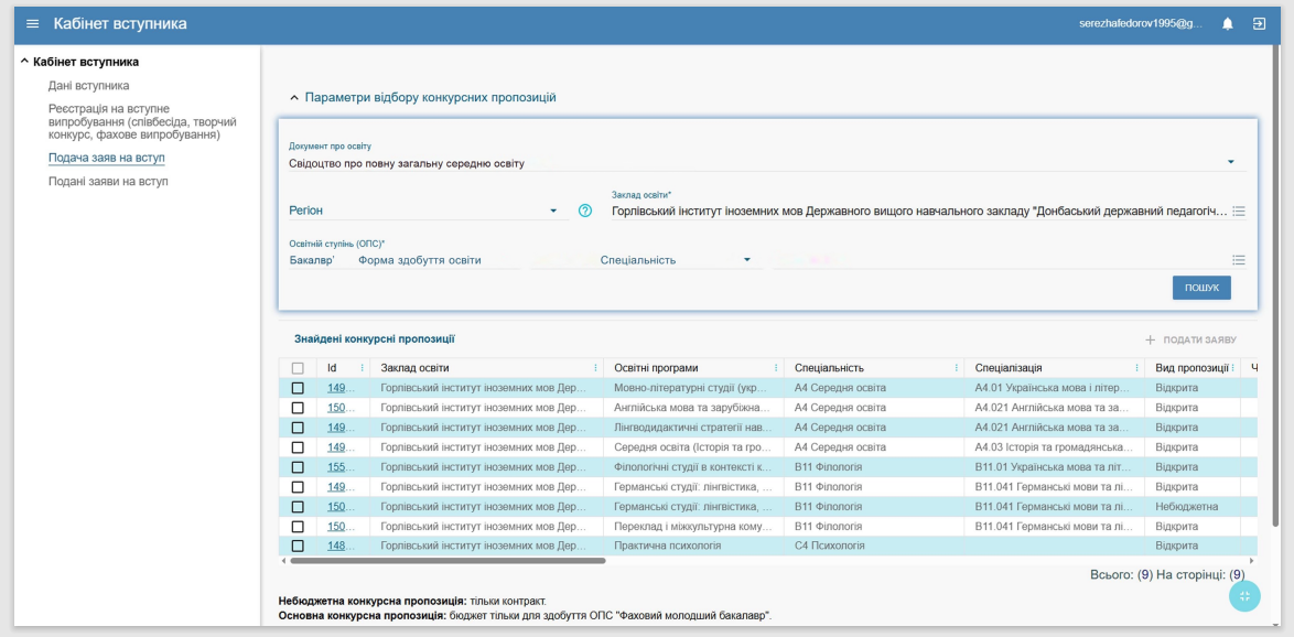 In the section Educational institution we write: Horlivka Institute of Foreign Languages, and we choose it.