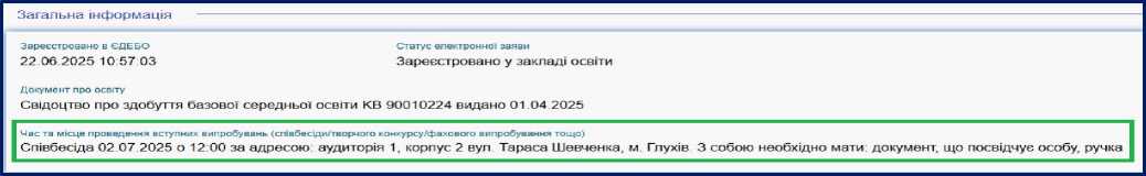 After processing by the educational institution, the application acquires the status of "Registered at an educational institution". If the educational institution enters information about the time and place of entrance exams, it is displayed in the submitted application in the field "Time and place of the tests (interview/creative competition/professional test, etc.)»: