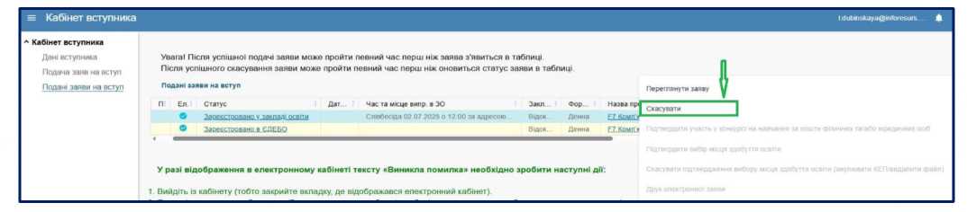 «Canceled by entrant» – the submitted application is considered as not submitted. This status is assigned to the application, if it is canceled by the entrant in your personal email account before the application is assigned the status "Registered at an educational institution" or "Requires clarification by the applicant." In this case, the applicant has the right to submit a new application with the same priority!