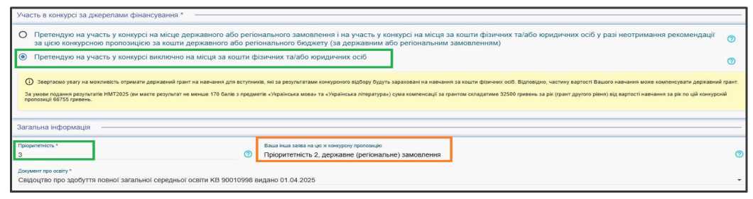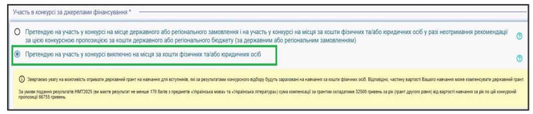 Please note that When choosing a non-budgetary competitive offer, it is possible to indicate only participation in the competition exclusively for places at the expense of individuals and/or legal entities (bottom mark):