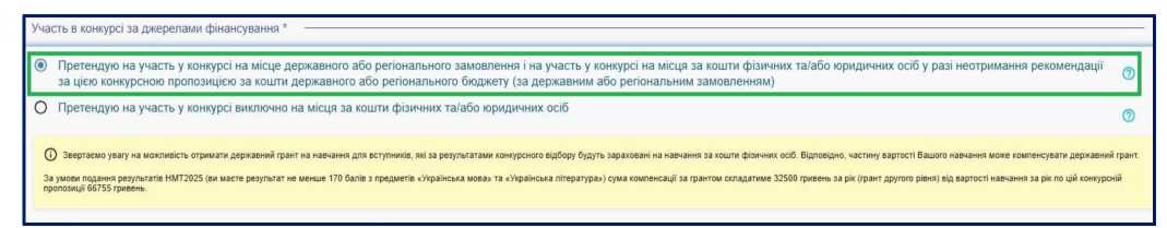 To submit an application in the competition for a place under a state or regional order (budget) and to participate in the competition for places funded by individuals and/or legal entities (contract) in the event of not receiving a recommendation for this competitive offer for funds from the state or regional budget, indicate the appropriate mark (top mark):