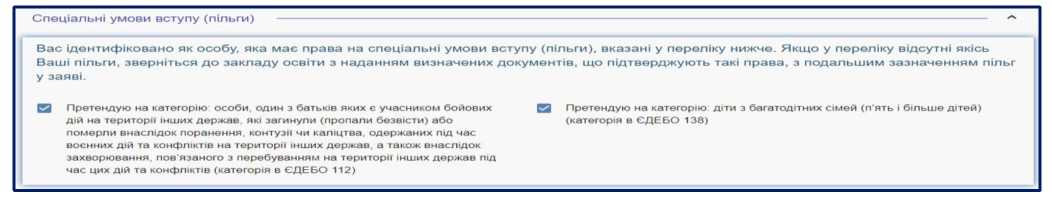 If you have special admission conditions (benefits), we recommend that before submitting applications for admission, contact the educational institution with supporting documents to enter this information into the EDEBO. If information about benefits has been entered, then when registering the application you will be able to select the appropriate benefit with which the application will be submitted. The list of benefits is posted in "Information materials» for the beginner.