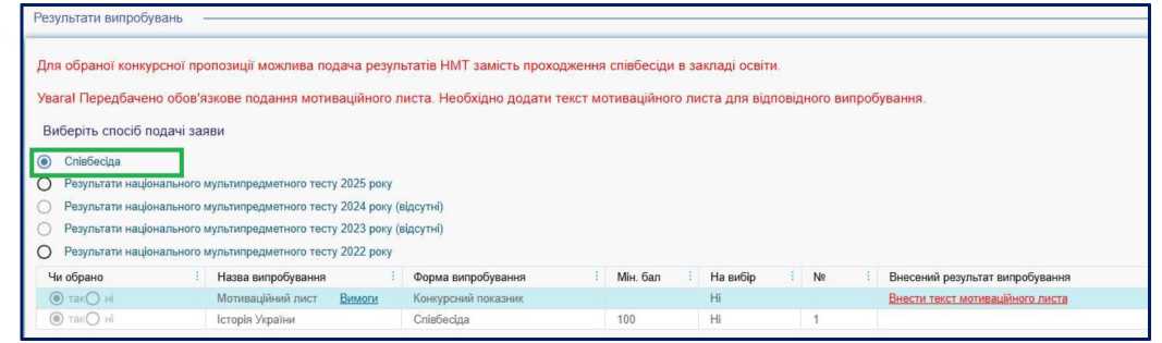 - in the absence of NMT results for 2022-2025, BUT in the presence of relevant benefits for the applicant provided for in the Admission Procedure, indicate the sign "Interview»: