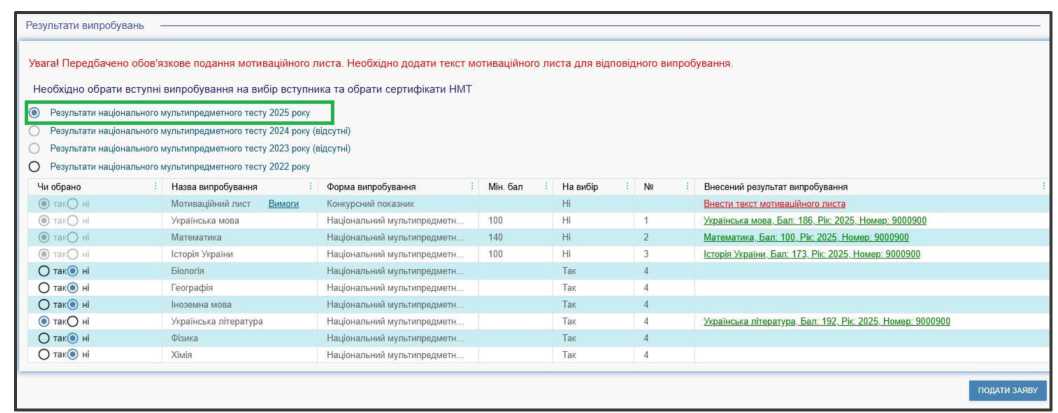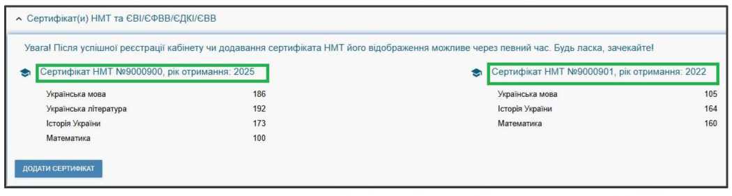 Please note that combining items from different years is NOT PROVIDED for in 2025 year! If you have multiple certificates, make sure they are added in your account: Entrant's data – Certificates of NMT and EVI/EFVV/EDKI/EVV: