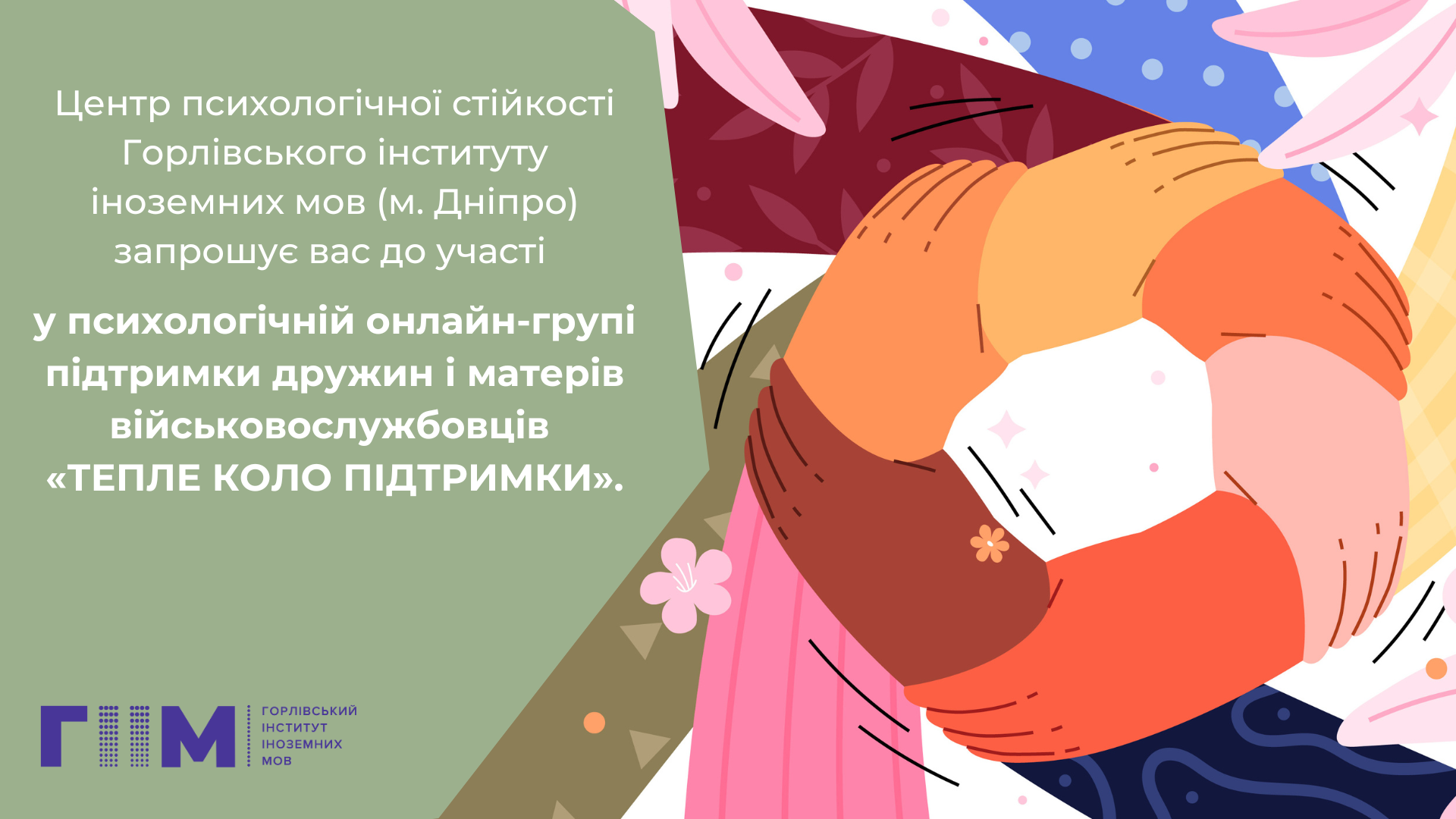 The Center for Psychological Resilience of the Horlivka Institute of Foreign Languages (Dnipro) invites you to participate in psychological online support group for wives and mothers of military personnel "Warm Circle of Support".