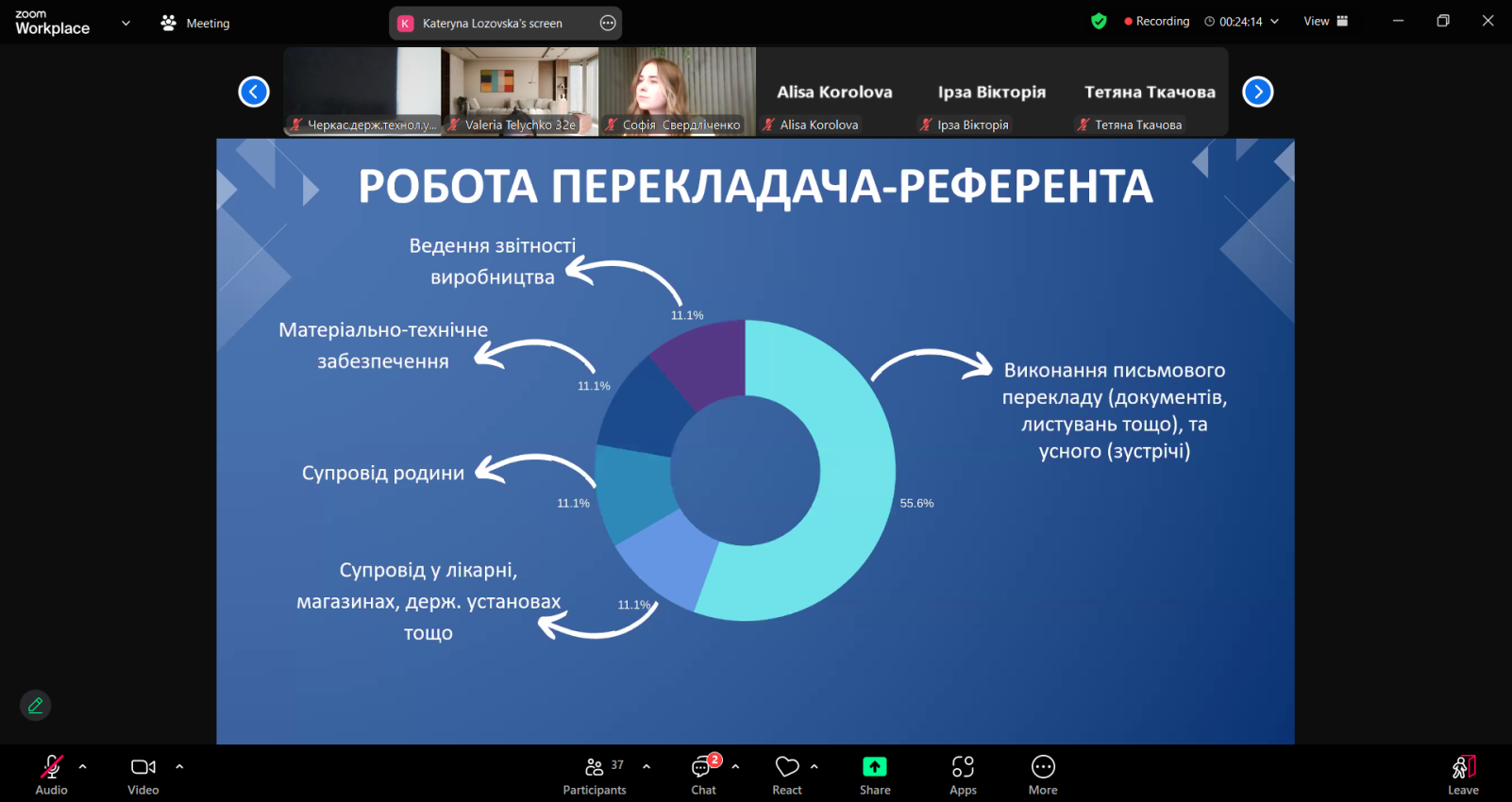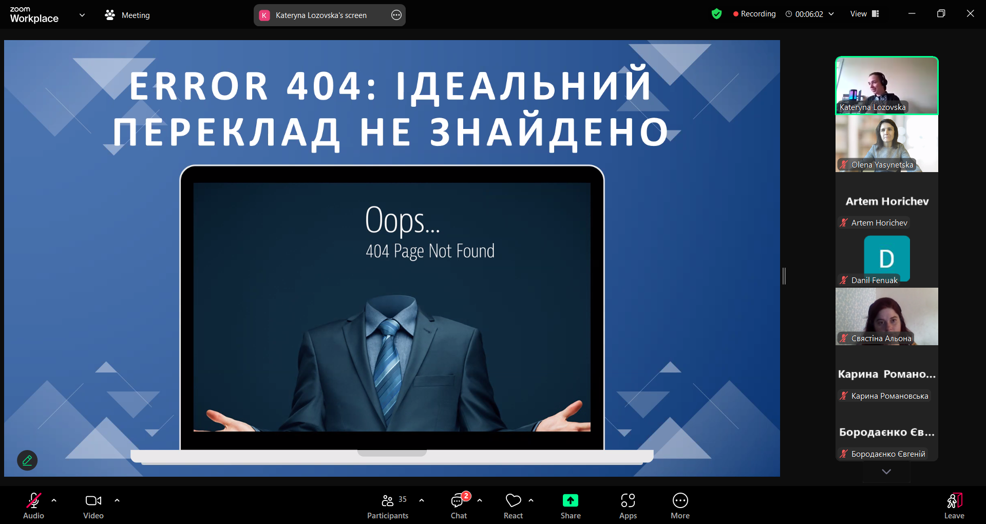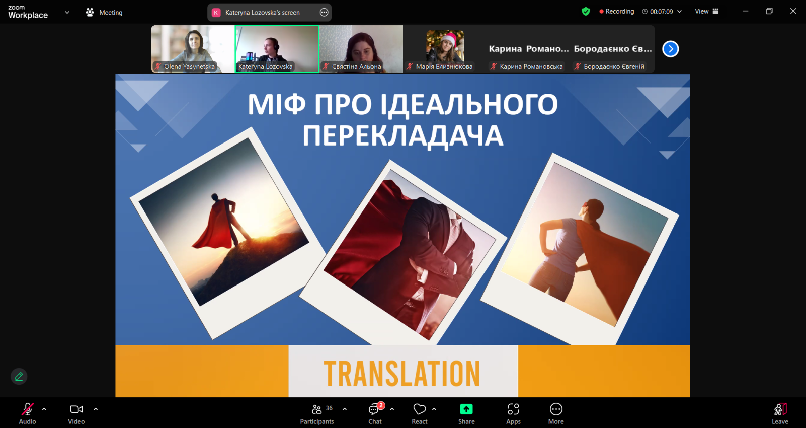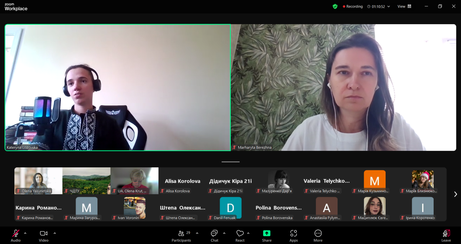 On September 15, 2025, at the invitation of colleagues from Zaporizhia National University, students and teachers of the Horlivka Institute of Foreign Languages of the State Higher Educational Institution of the State University of Translation and Interpretation of Ukraine took part in two online lectures dedicated to modern aspects of translation activity. Interesting, meaningful, and exciting lectures were given by Kateryna Oleksandrivna Lozovska, a teacher and translator with experience in technical and administrative fields. The first lecture – “Error 404: ideal translation not found” – was aimed mainly at junior students, but became an inspiration for all those present. The speaker shared her own stories of professional development, talked about the first difficulties in translation, and advised how to overcome the fears of a beginner. Special attention was paid to the fact that mistakes are not defeats, but useful experience that forms professionalism. The second lecture - "FOP without panic: how to start your own business and not get lost in the papers" - was of particular interest to senior students who are preparing for independent professional activity; participants received practical advice on opening a FOP, choosing its group, keeping reports and features of taxation. The lectures contributed to the professional development of education seekers and strengthening partnership and friendly ties between the Horlivka Institute of Foreign Languages and Zaporizhia National University. We thank the lecturer Kateryna Oleksandrivna Lozovska and the organizer of the event Margarita Vasylivna Berezhna for the invitation and the inspired exchange of experience. May she be lucky in all good deeds! We wish you peace, safety, encouragement, stability and new professional achievements!