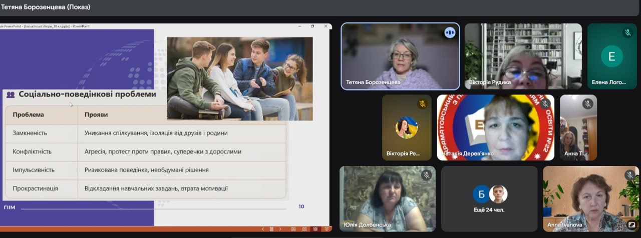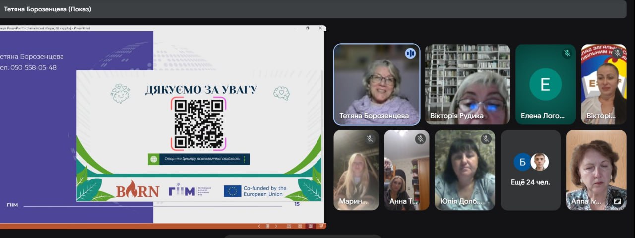 At the invitation of the administration of the ZZSO 22 named after M.M. Krupchenko in Kramatorsk, the head of the Department of Psychology of the State Institute of International Relations, Candidate of Political Science, Associate Professor Tetyana Borozentseva, from September 16 to September 19, 2025, took part in meetings of the school's teaching staff with parents of tenth-graders, where the possibility of organizing online trainings for high school students was discussed by the Center for Psychological Resilience of the Horlivka Institute of Foreign Languages, which operates with the support of the Erasmus+ KA2 BURN project - "Strengthening Psychological Resilience and Well-being of the University Community in the (Post-)War Ukrainian State", funded by the European Union.