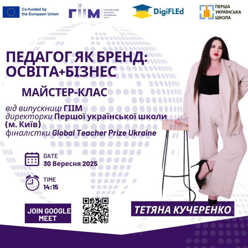 As part of the Erasmus+ educational project "Modernization of university educational programs in foreign languages through the integration of information technologies (DigiFLEd)", the master class will be held✨ by Kucherenko Tetyana, graduate of GIIM, director of the First Ukrainian School (Kyiv), Project Manager at the "All-Ukrainian Online School"…