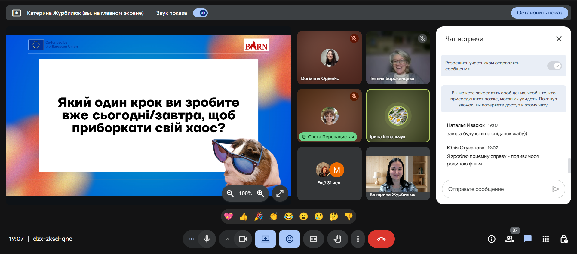 The participants also completed the exercise "My chaos → my order," during which each identified their "time wasters" and broke down chaotic tasks into specific steps.