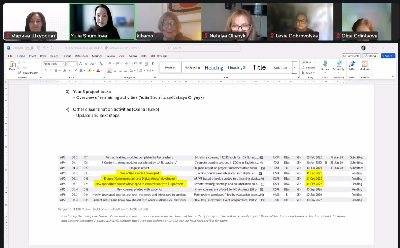 - Analyzed developedand educationaland courseand, discussed the developed materials and the current piloting. The course development managers agreed with the European partners to hold a series of additional working meetings by the end of 2025, during which expert feedback and suggestions for improving the course content will be considered. The piloting will continue within the third year of the Project implementation.