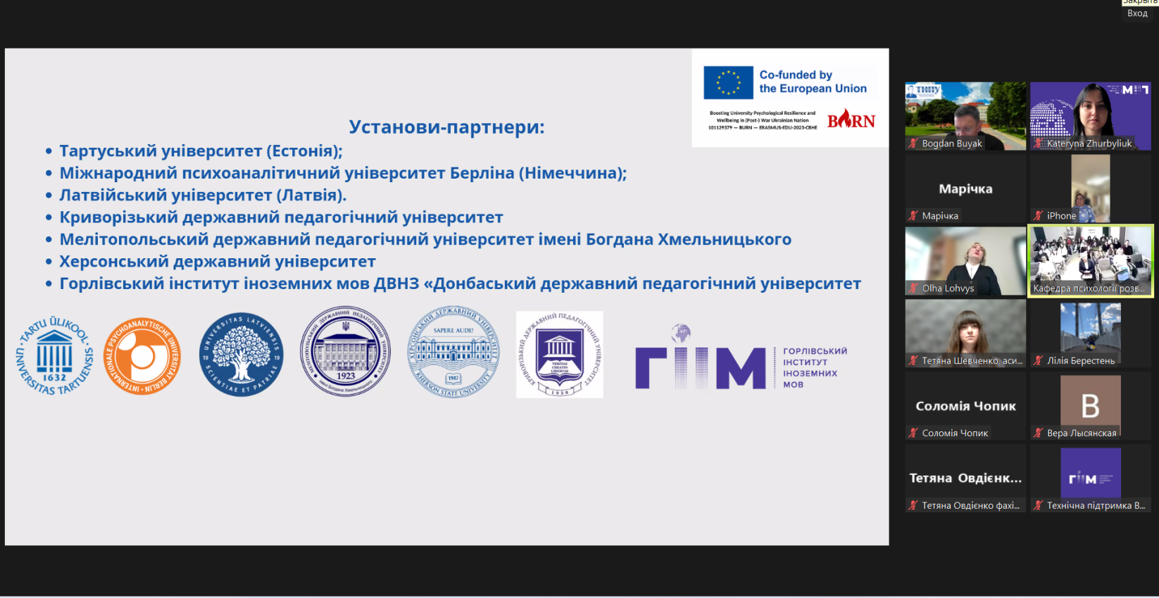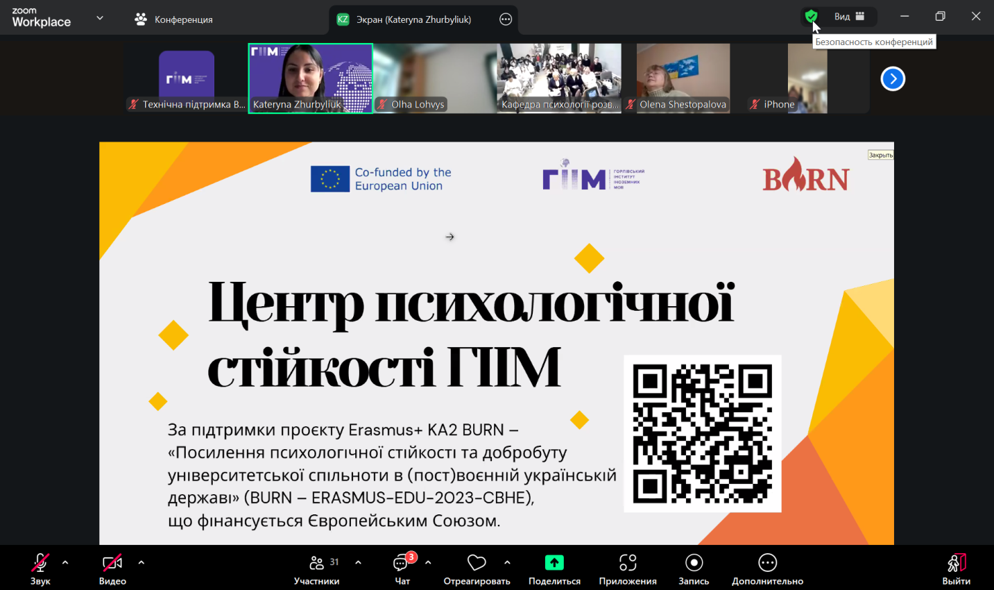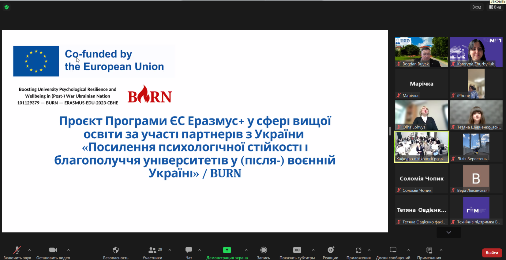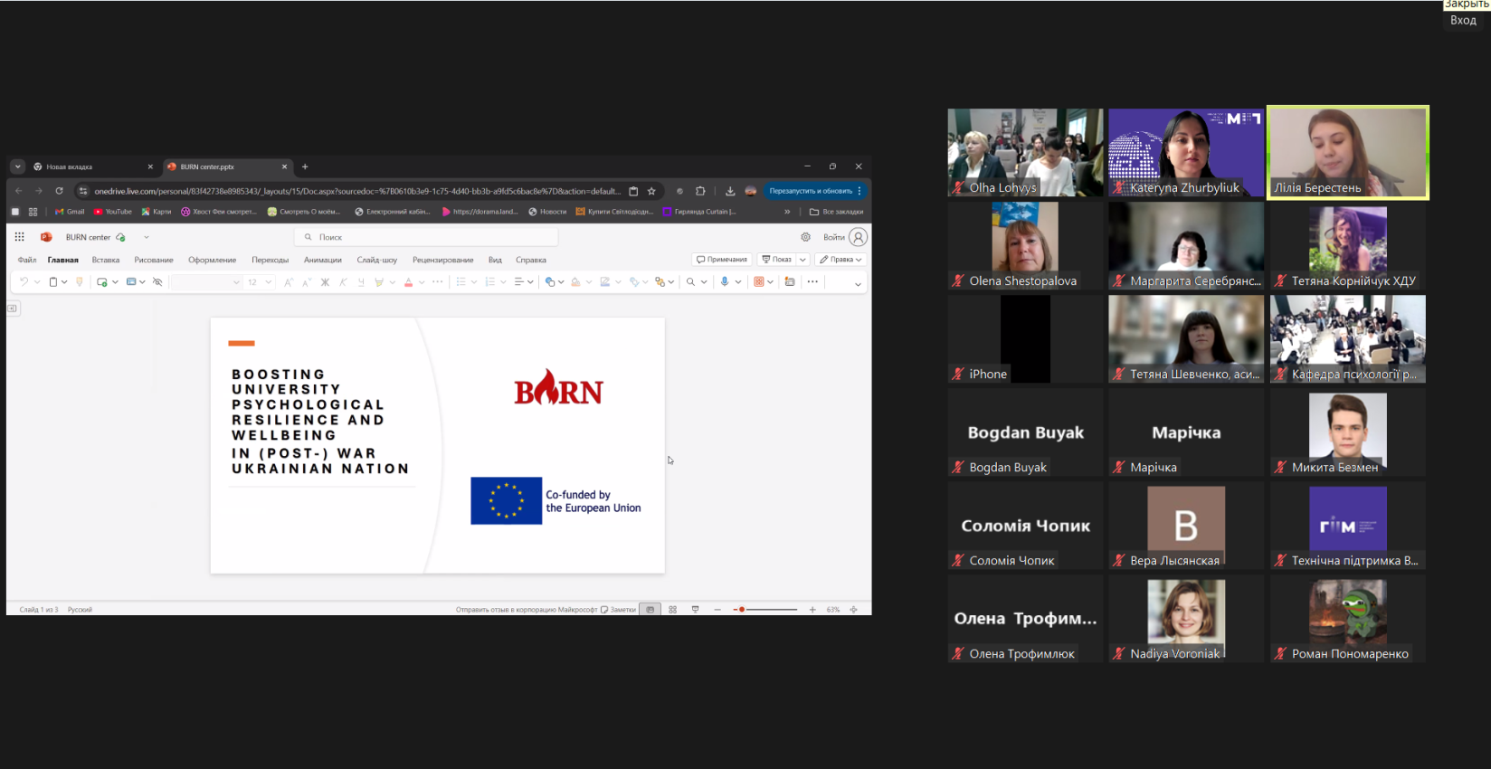 On October 10, World Mental Health Day, an open online meeting was held dedicated to the creation and development of Centers for Psychological Resilience and Well-being at Ukrainian universities - partners of the international project of the EU Erasmus+ Program "BURN" ("Strengthening Psychological Resilience and Well-being of Universities in a (Post)War Country"). During the meeting, the coordinators of the centers shared their own experience of opening such centers, talked about their activities, current achievements, as well as the challenges they face in the process of implementing initiatives.