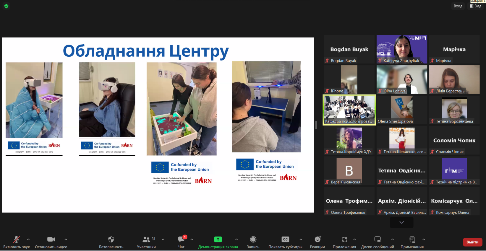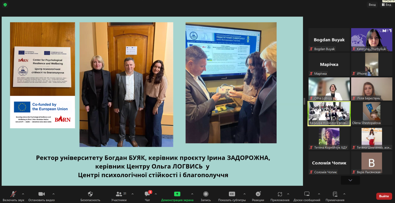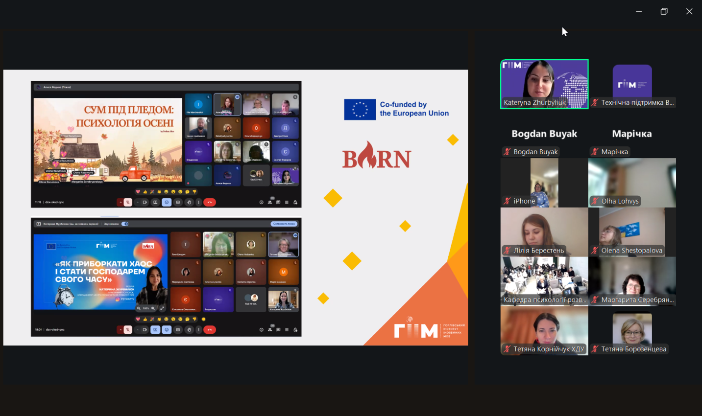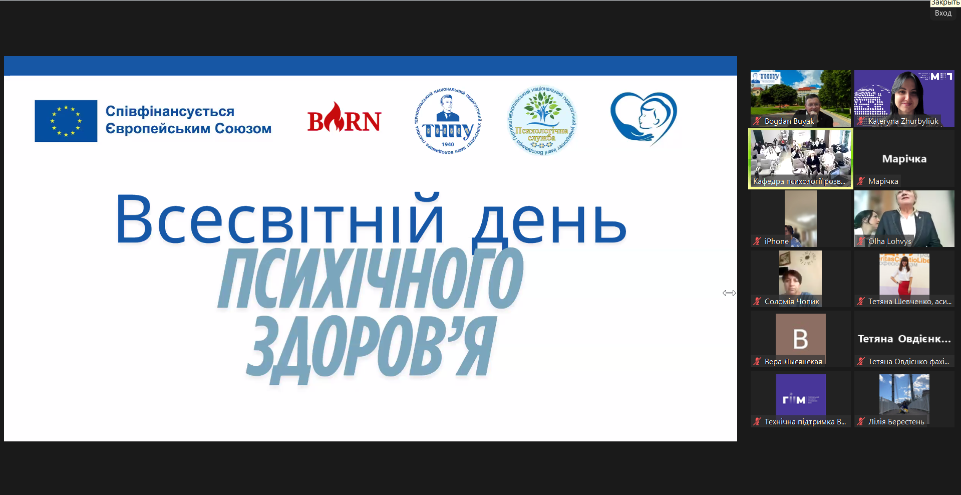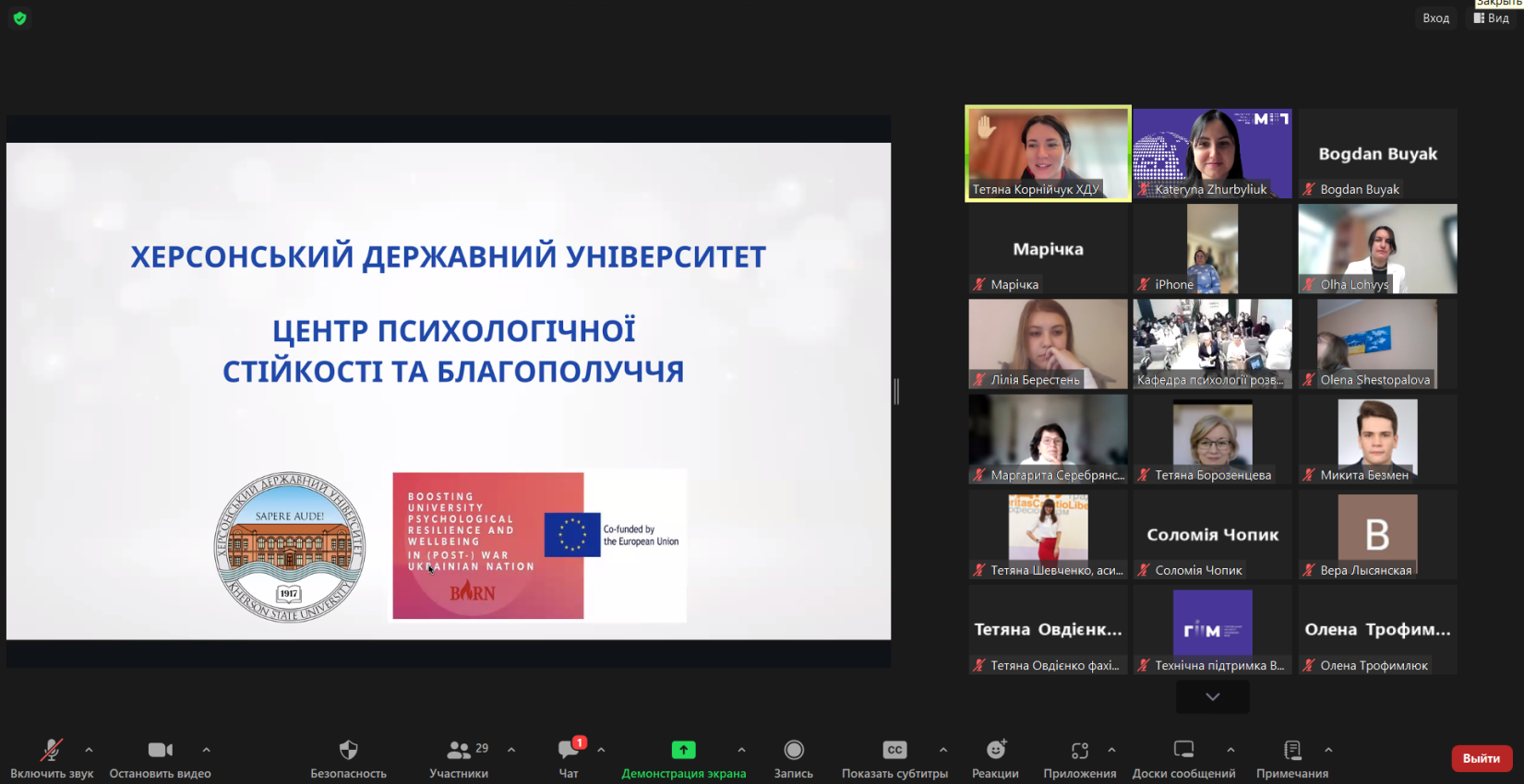 On October 10, World Mental Health Day, an open online meeting was held dedicated to the creation and development of Centers for Psychological Resilience and Well-being at Ukrainian universities - partners of the international project of the EU Erasmus+ Program "BURN" ("Strengthening Psychological Resilience and Well-being of Universities in a (Post)War Country"). During the meeting, the coordinators of the centers shared their own experience of opening such centers, talked about their activities, current achievements, as well as the challenges they face in the process of implementing initiatives.