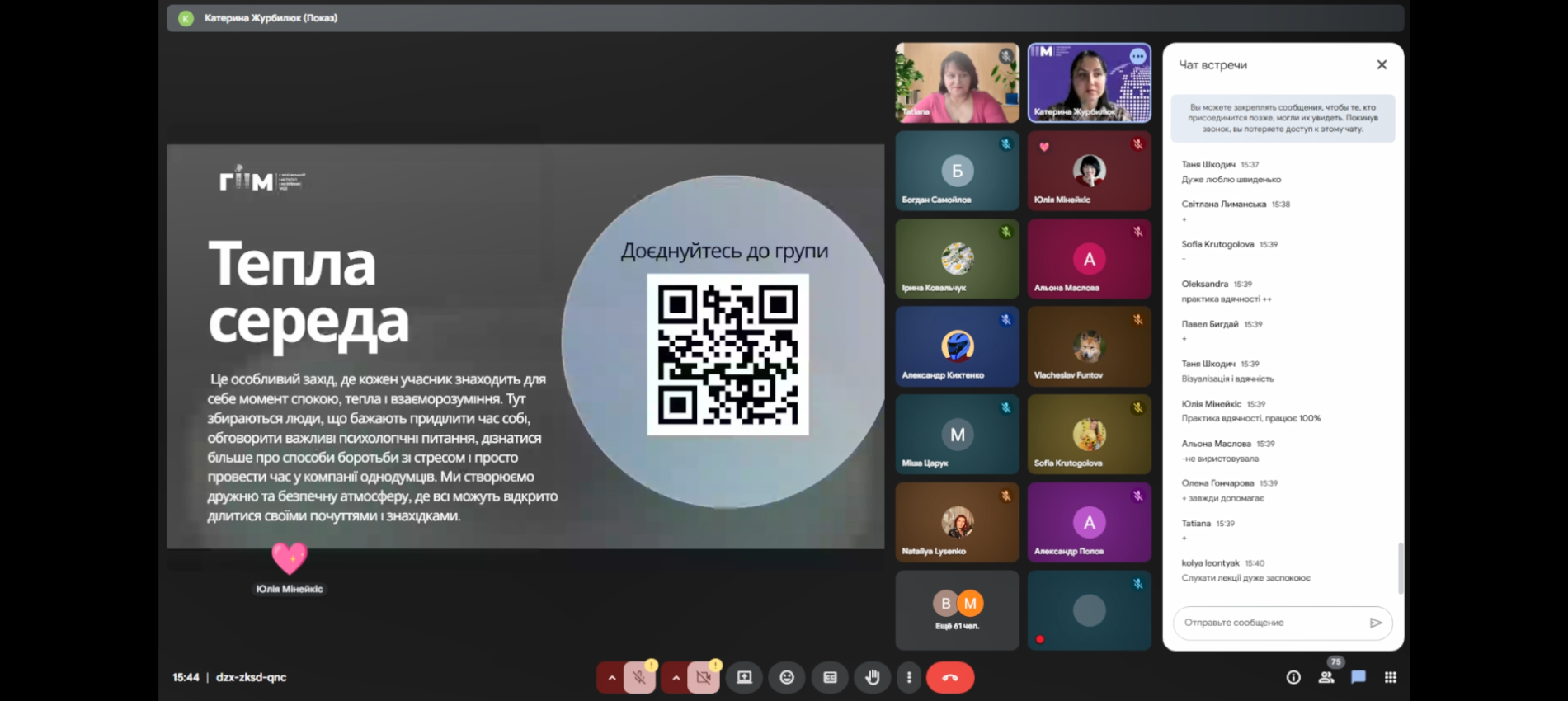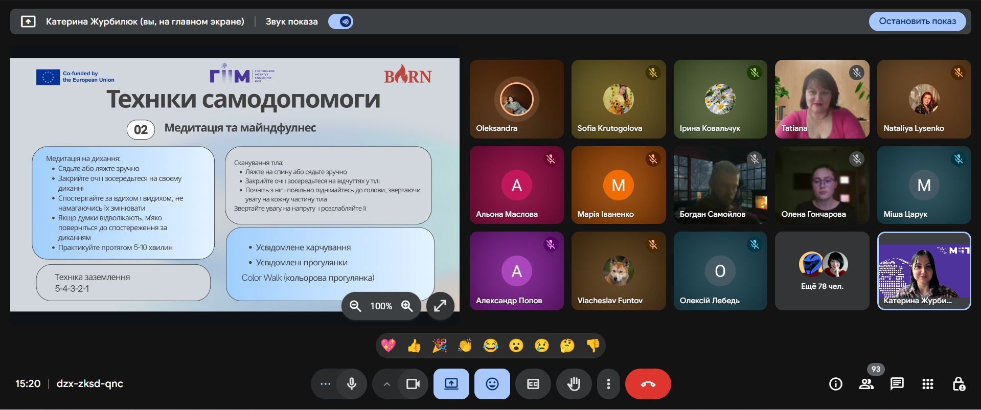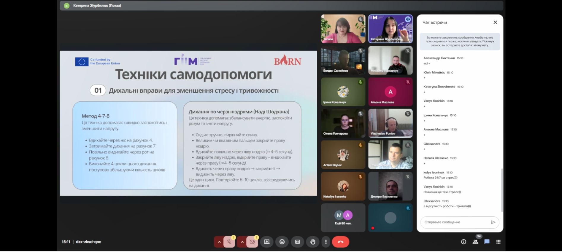 The webinar "How to Gain Inner Peace: Practical Techniques for Overcoming Stress and Anxiety" brought together about 100 participants — young people from higher, pre-university, and vocational education institutions temporarily relocated from the Bakhmut urban community to safer regions of Ukraine. The goal of the meeting was to provide young people with effective tools to support mental health in today's difficult conditions.