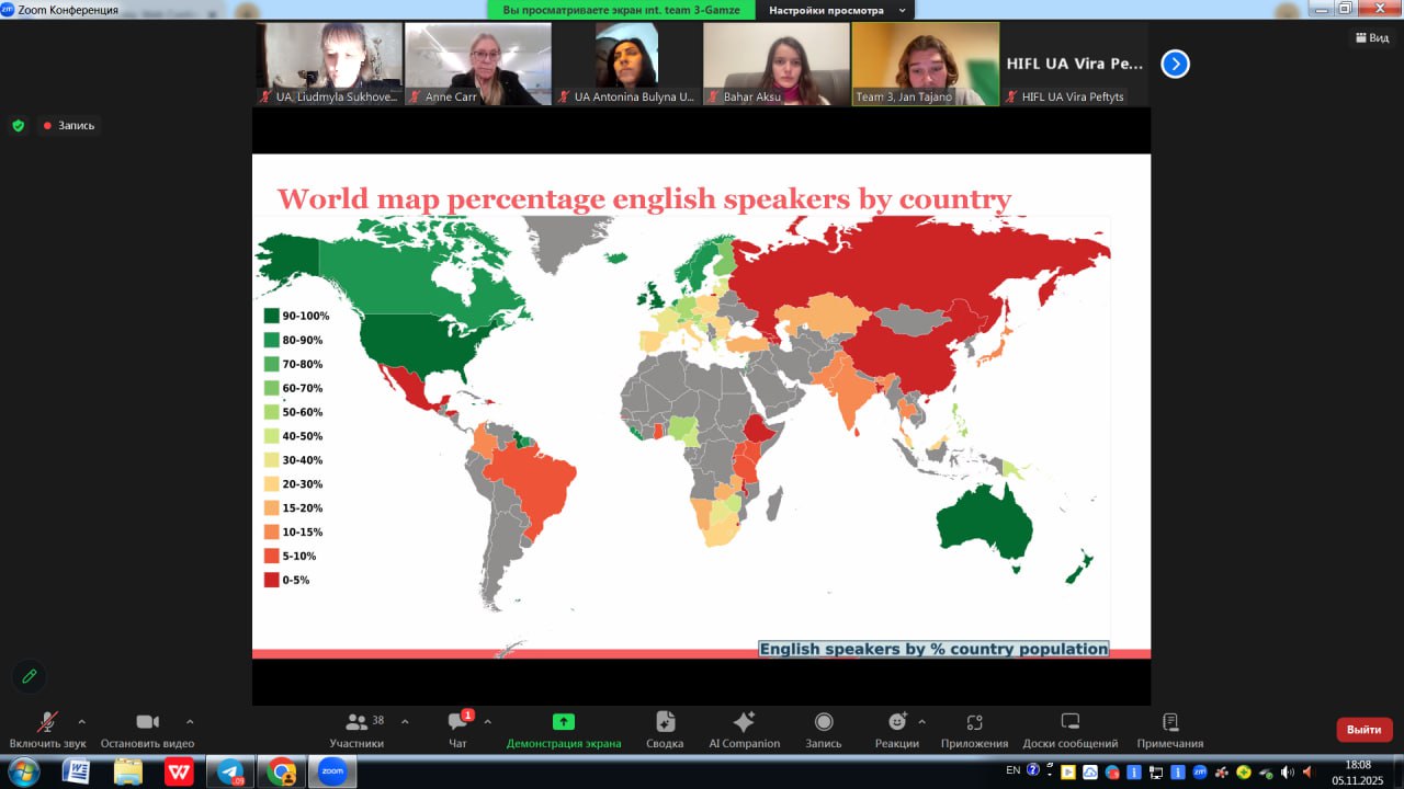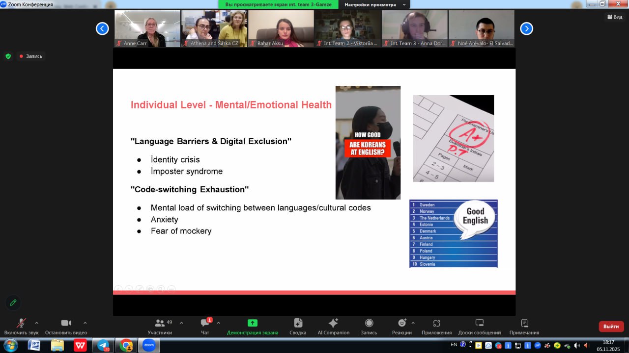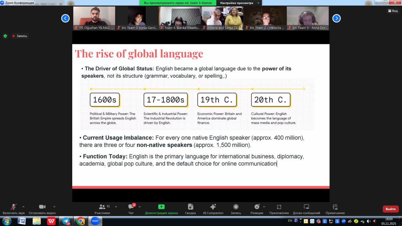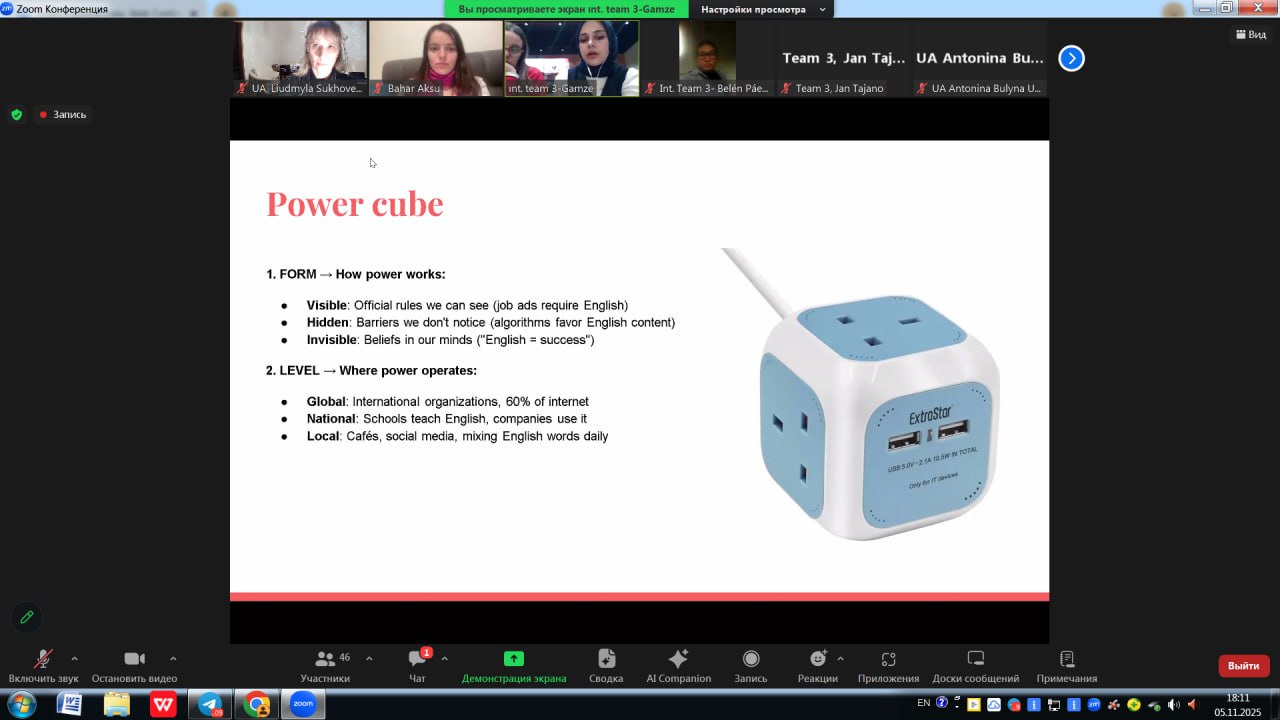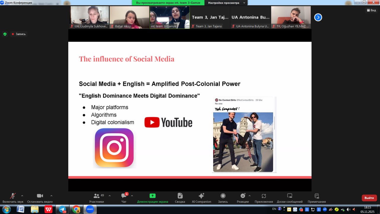 November 5, 2025 within the project POWER CUBE the results of the joint work of the third international team on the topic were presented Power of Language: English as Postcolonial Issue. The team considered the reasons that contributed to the formation of the status of English as an international language, as a lingua franca. It clearly demonstrated the geographical spread of English in the world; the ratio of native speakers of English and speakers of English as a second foreign language. Vivid examples confirmed the fact that English is the language of diplomacy, business, education, pop culture and online communication. A variant of the future development of society in conditions of dominance of English was briefly outlined, the participants drew attention to the growing need to protect national languages at the local level, which should contribute to the preservation of language diversity in the world. A graduate of our university participated in the preparation of the presentation of the third team Doronchenko G. (gr.211a). In the discussion, the applicants supported Miller S. (gr. 504a), Peftits V. (gr. 241), CIlkina V. (gr.504). The teaching staff is represented by Ph.D., Assoc. Prof. Sukhovetskaya L. V. and Ph.D., Assoc. O. S. Shlapakov. Sincere thanks to everyone! See you next Wednesday!