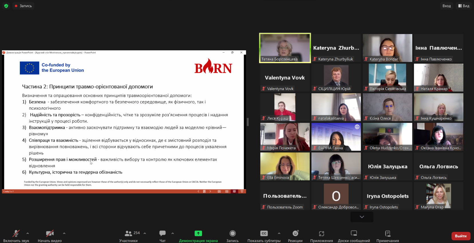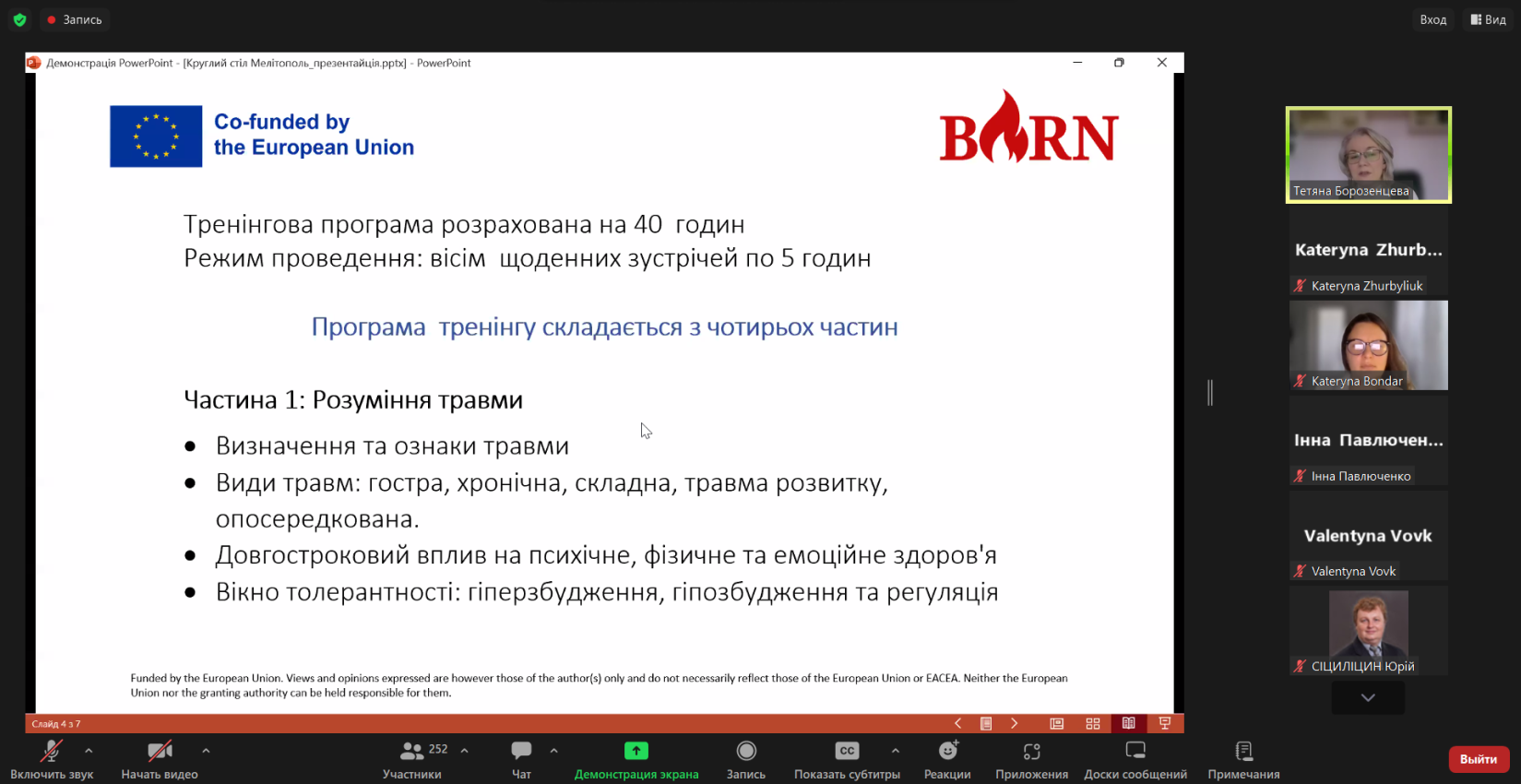 on the development of training programs based on trauma-informed approaches for the project's summer schools. Trauma-informed practice is a philosophy of interaction that recognizes the impact of trauma on a person and develops environments and methods that support the person, rather than retraumatize. The summer school training program (40 hours) will help professionals who today provide social, psychological, and educational services to people with traumatic experiences of war events.