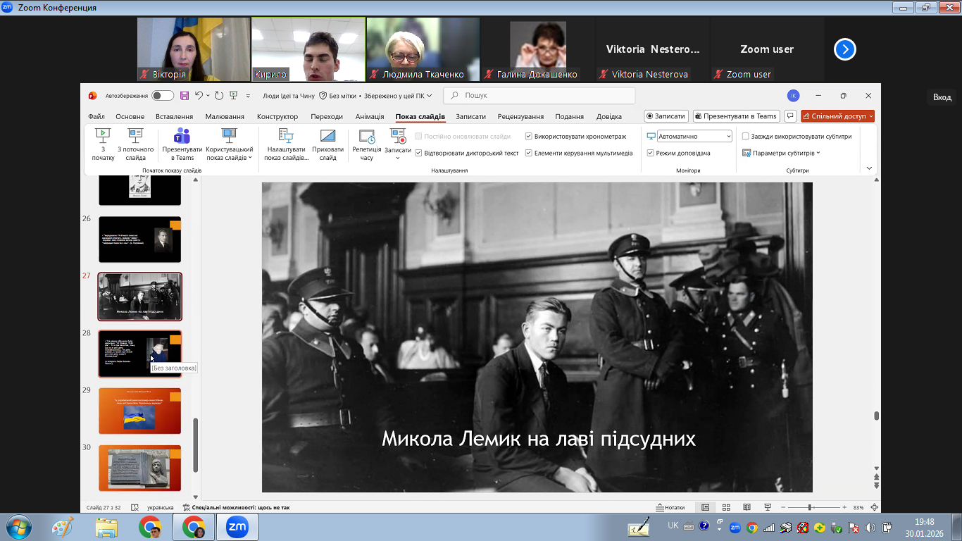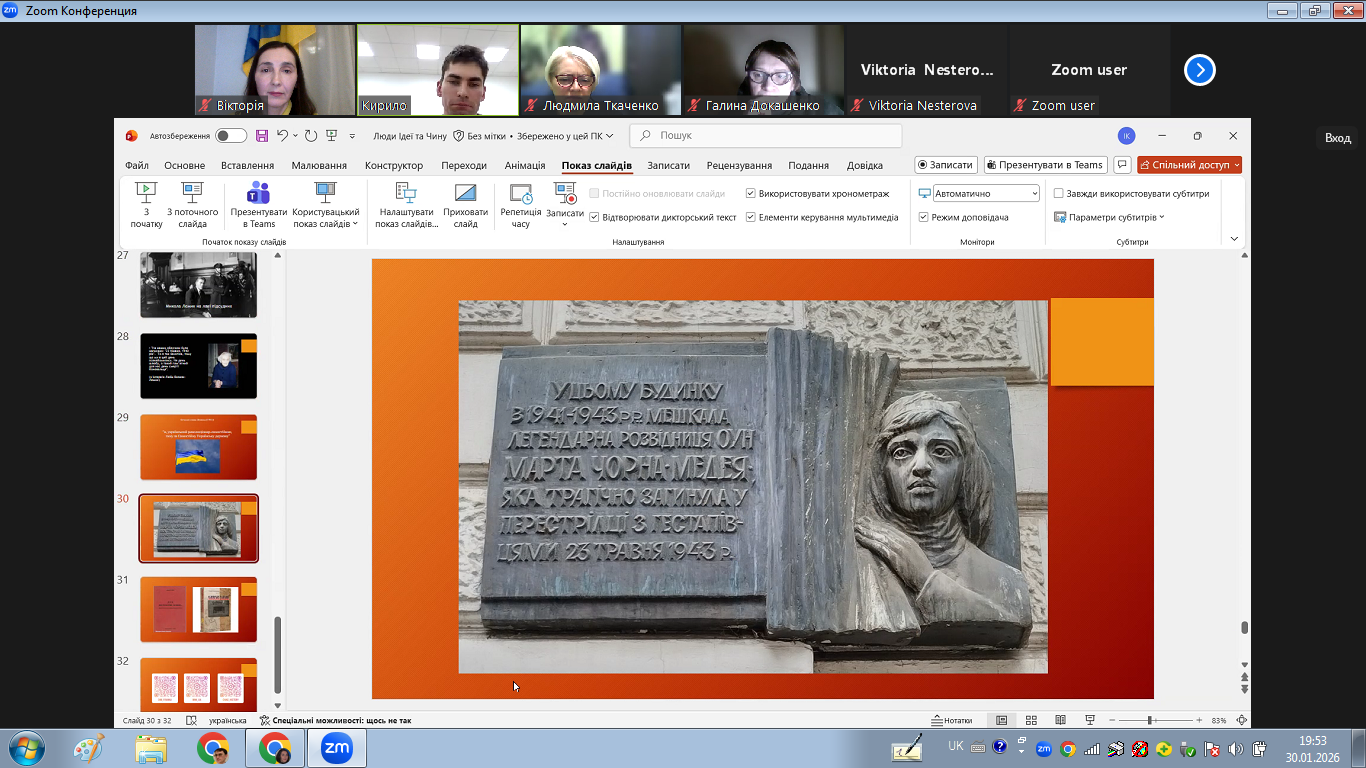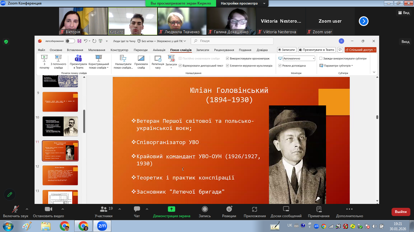 The meeting was attended by visitors to the club, other students, teachers and employees of the institute. During the online excursion, those present learned more about the places associated with the life and activities of the figures of the Ukrainian Military Organization (UVO) and the Organization of Ukrainian Nationalists (OUN). Dwelling in more detail on the figures of Yulian Golovinsky, Mykola Lemek, and Marta Chorna, the speaker showed what the leaders of the Ukrainian national liberation movement fought for, what methods of struggle and resistance they used, who these people were in everyday life, what prompted them to risk their own lives for the sake of their goal.