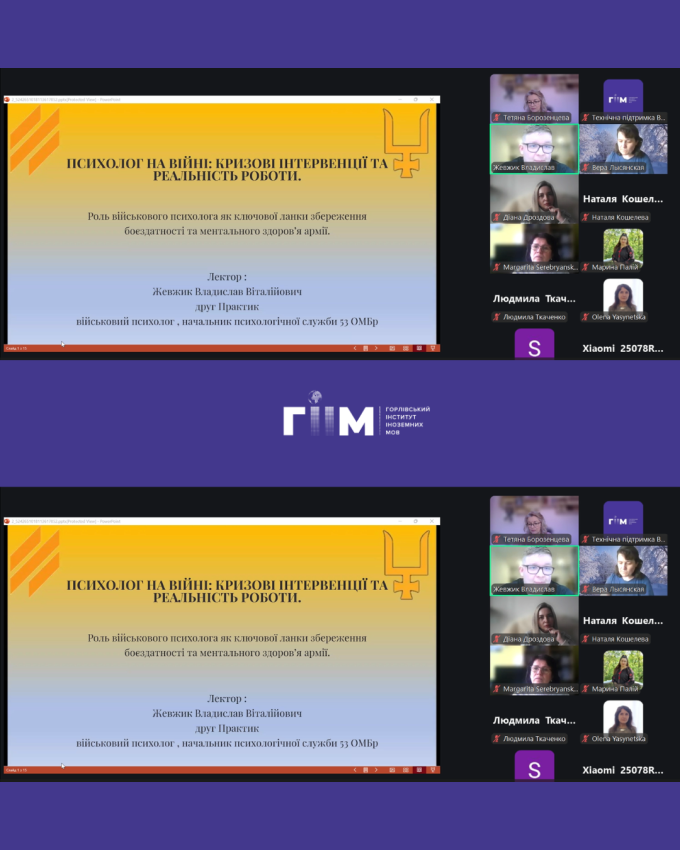 On February 20, 2026, at 1:00 PM, a guest lecture on the topic "Psychologist at War: Crisis Interventions and What a Military Psychologist Actually Works With" was held online on the Zoom platform. The speaker of the meeting was Vladislav Vitaliyovych Zhevzhyk, a military psychologist and head of the psychological service of the 53rd Motorized Rifle Brigade.