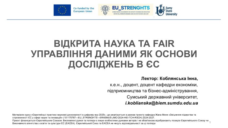 Share Online school "Digital technologies in scientific research" OPEN SCIENCE AND FAIR DATA MANAGEMENT AS BASIC RESEARCH IN THE EUApr 17, 2025Read morePublication of a scientific articleOctober 5, 2024Read moreGuidelines for creating an account and adjusting your ORCIDSep 10, 2024Read moreGrant opportunities of the National Research Fund of UkraineMay 28, 2024Read moreA practical tour of the Funding and Tenders Portal and certain aspects of the preparation of project proposalsMay 28, 2024Read moreAuthor profile management in ScopusApril 23, 2024Read moreRESEARCHER PROFILE in Web of ScienceApril 23, 2024Read moreOpen Science – An Introductory GuideFebruary 16, 2024Read more"Going through challenges: to publish in Scopus and WoS free of charge"February 2, 2024Read moreGeneral principles of creating presentations - Vakalyuk T.A.January 10, 2024Read moreCHATGPT for a scientist - Vashchuk O.January 10, 2024Read moreDigital technologies in scientific activity: data processing and visualization - K. Godlevska.January 10, 2024Read moreCollection of research data in the open information space: tools, opportunities, limitations and ethical aspects - I. Gubeladze.January 10, 2024Read moreDigital technologies for creating questionnaires and surveys (messengers and google forms) - V. Kovalenko.January 10, 2024Read moreDigital technologies and academic integrity - Kotun K.January 10, 2024Read moreDigital technologies in scientific research - O. Mandych.January 10, 2024Read moreSystems of conducting conferences and some subtleties regarding the submission of articles in Scopus - Marienko M.January 10, 2024Read moreScientometrics and evaluation of the researcher's scientific contribution - Yatsyshyn A.January 10, 2024Read moreShaping the image of a scientist: trends and digital tools - Yatsyshyn A.January 10, 2024Read moreFurther