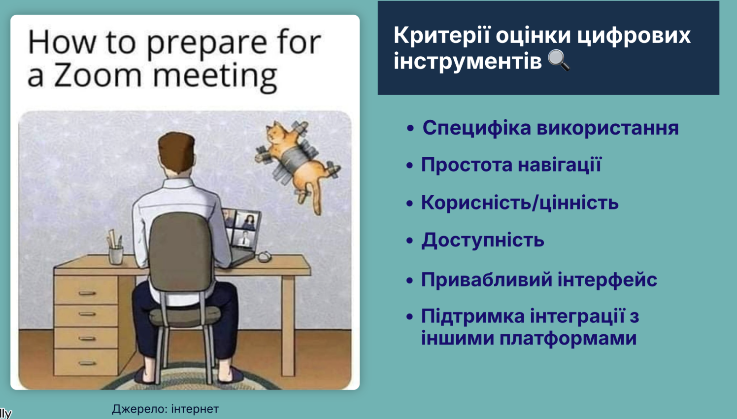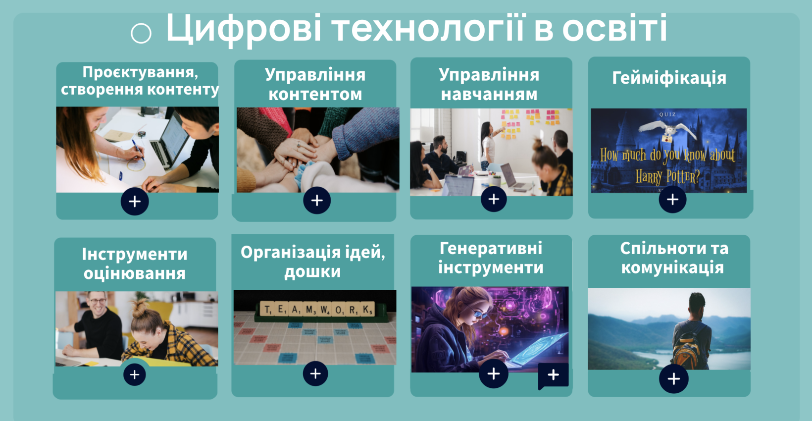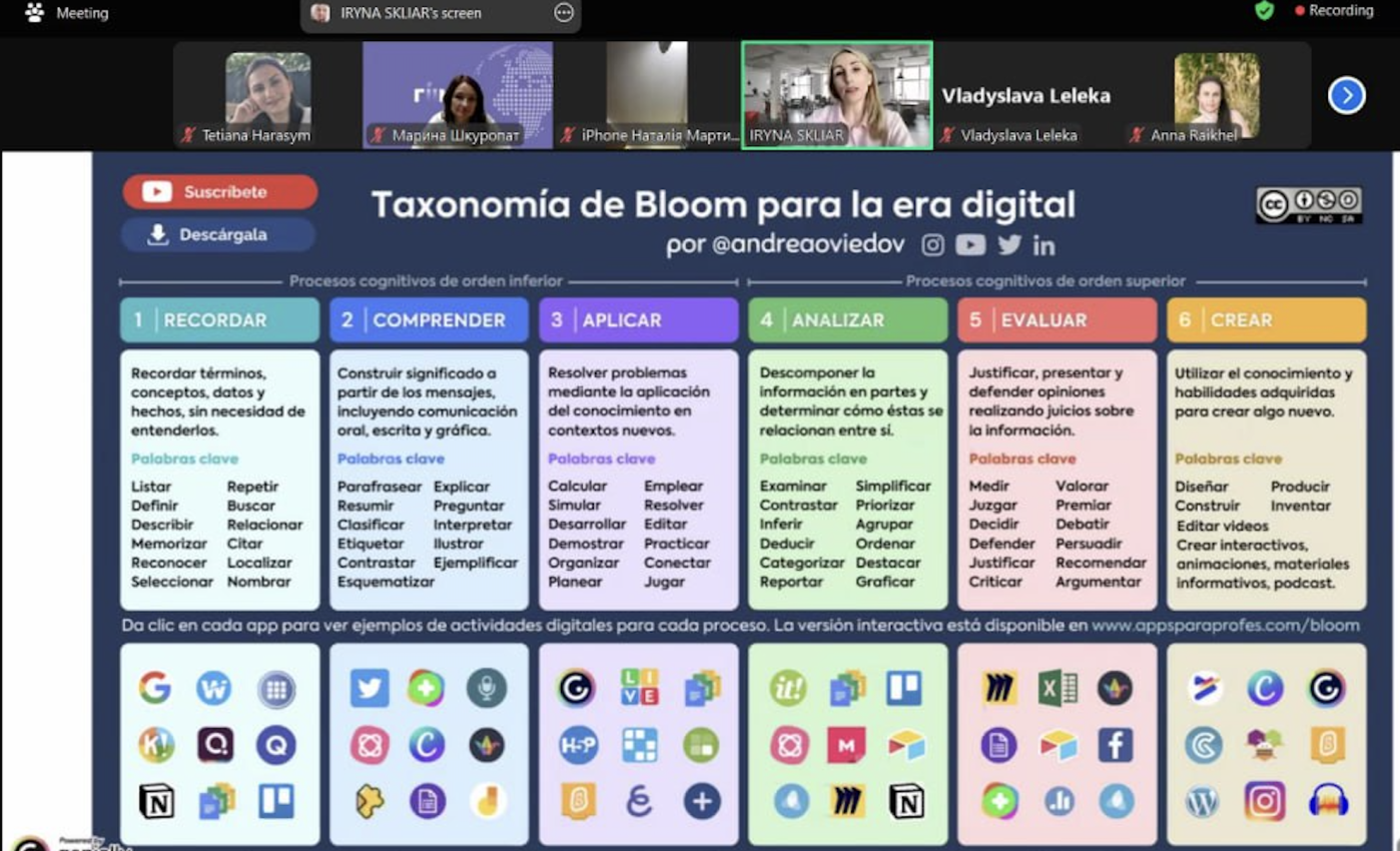 Під час вебінару пані Ірина ознайомила слухачів з актуальними вітчизняними та зарубіжними класифікаціями цифрових інструментів, що можуть значно збагатити та урізноманітнити процес викладання навчальних дисциплін. Особливу увагу було приділено практичному застосуванню конкретних онлайн-сервісів.