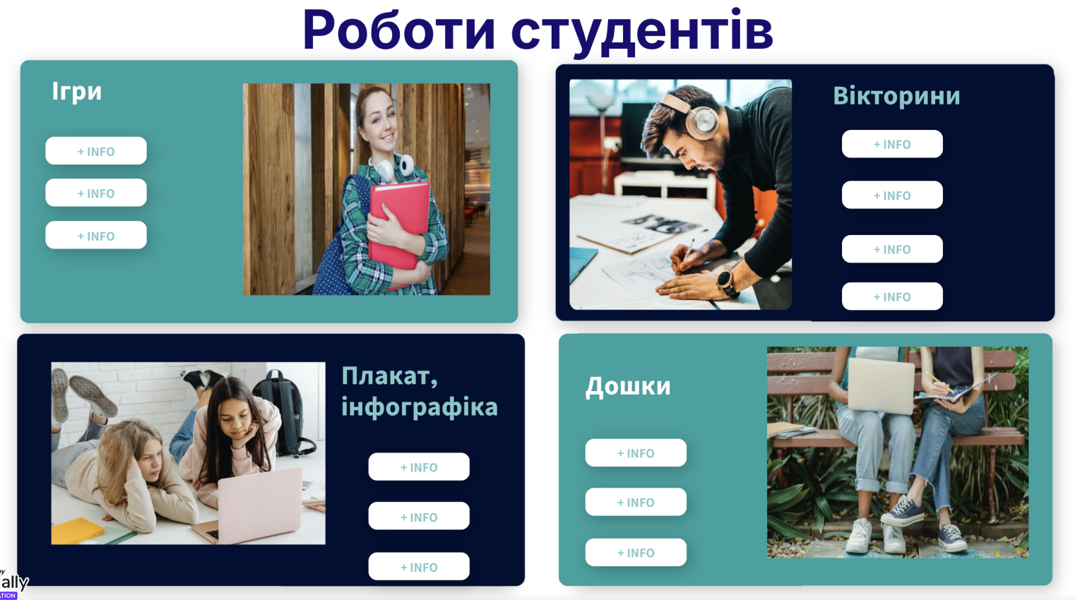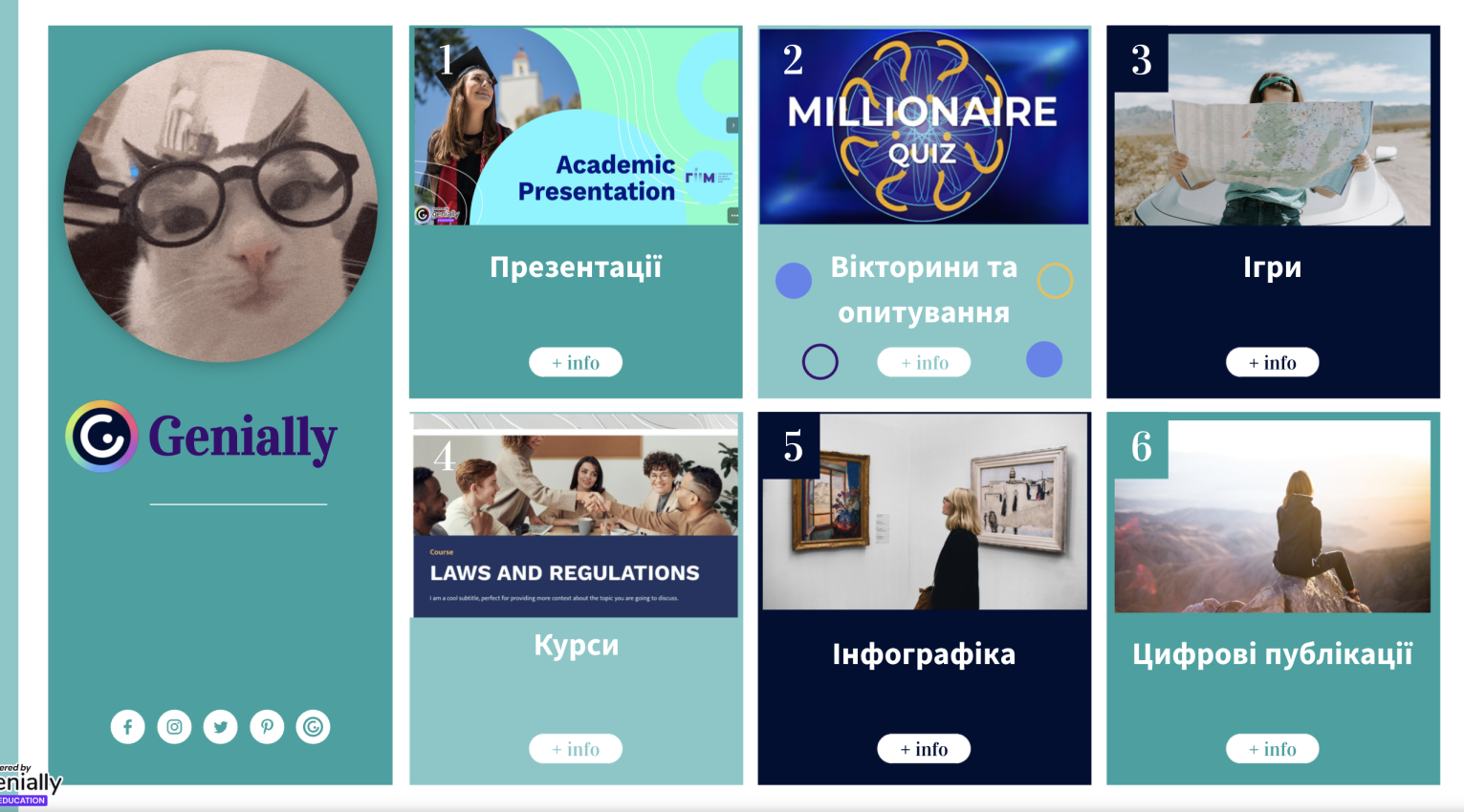 - Genially – це онлайн-платформа, яка відкриває безмежні можливості для створення інтерактивного навчального контенту, зокрема легко розробляти яскраві презентації з анімацією та клікабельними елементами, захопливі інфографіки, цікаві вікторини, тести, креативні escape-room завдання. Genially поєднує зручність використання, візуальну привабливість та широку функціональність без необхідності програмування.