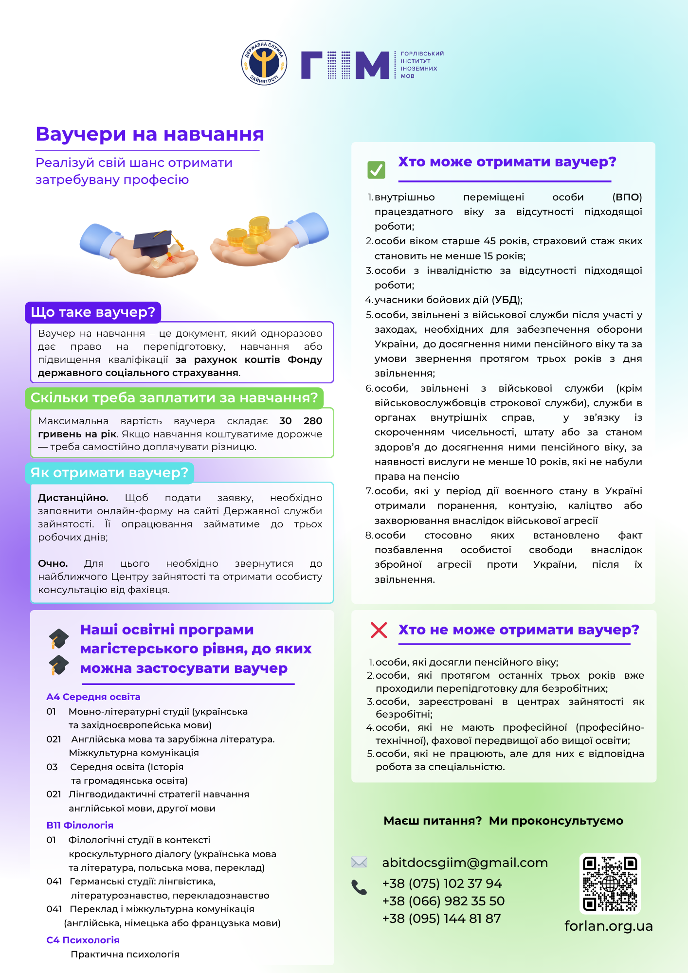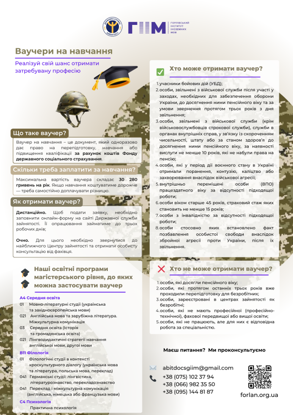 З питань попередньої реєстрації та отримання детальної інформації щодо вступу за ваучерами звертайтеся до відбіркової комісії ГІІМ: